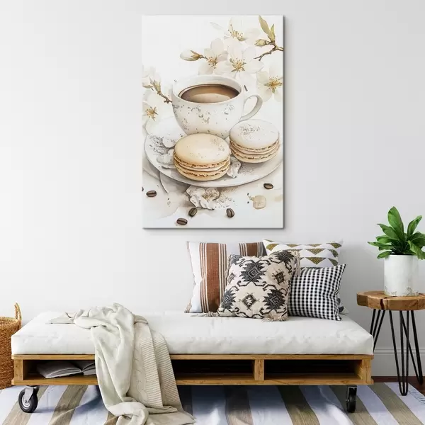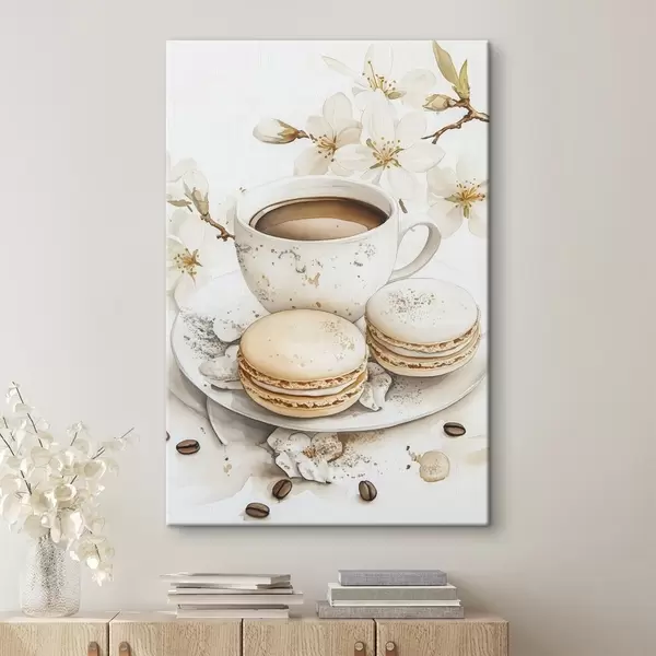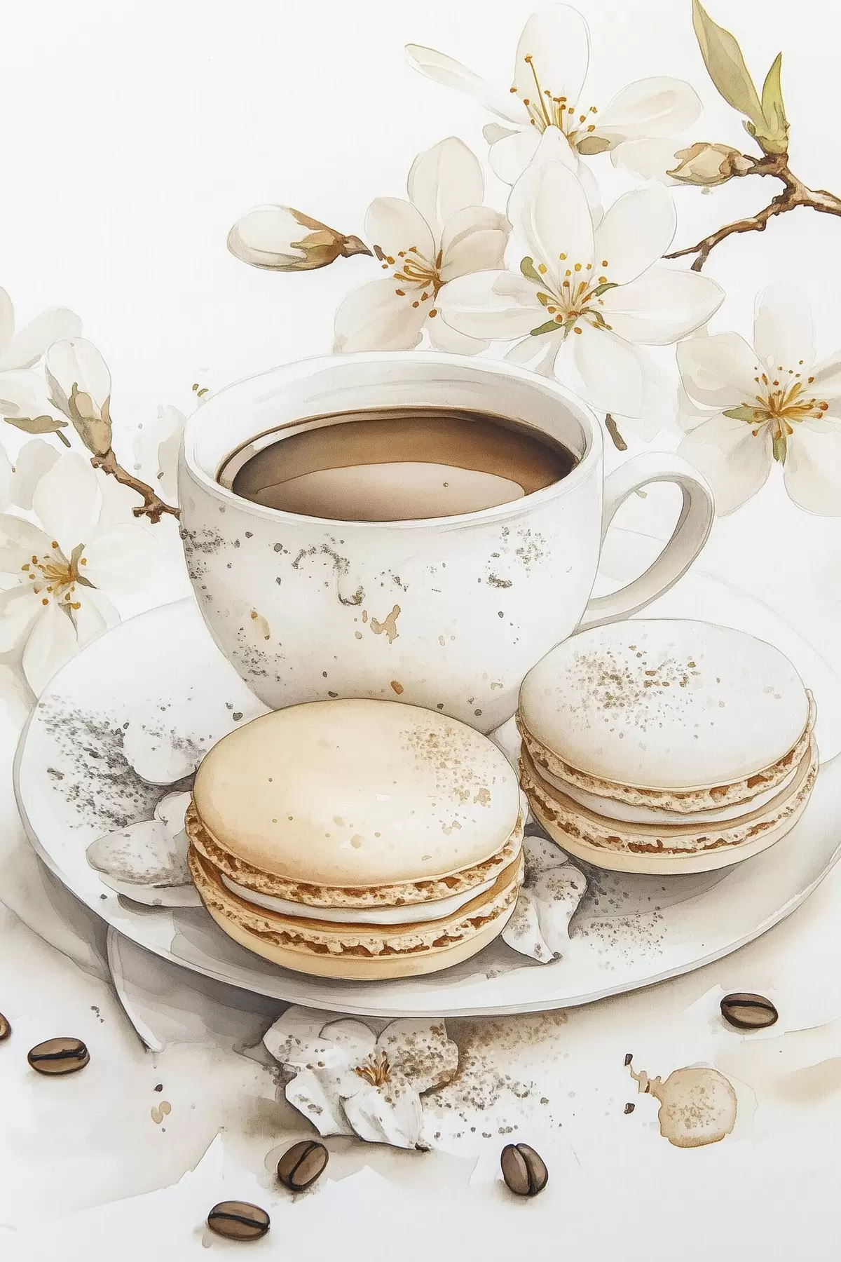 Maalid Tass kohvi makroonidega, akvarellstiilis, pehmed värvid, jasmiinililled Nr s41949