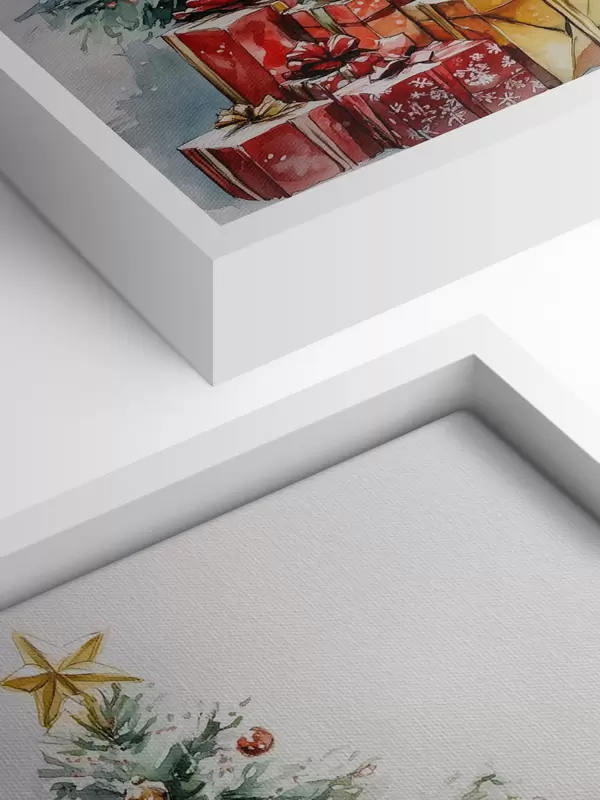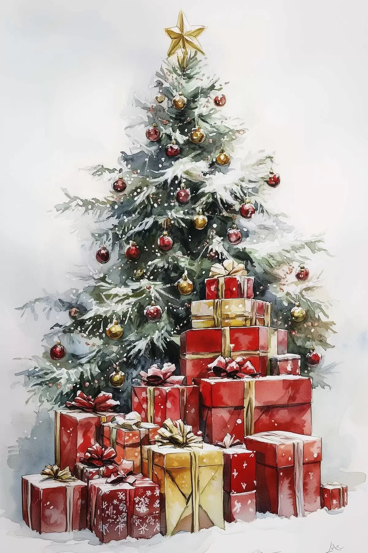 Maalid Pidulik jõulupuu koos pakitud kingitustega, lumi, akvarellstiilis Nr s41953