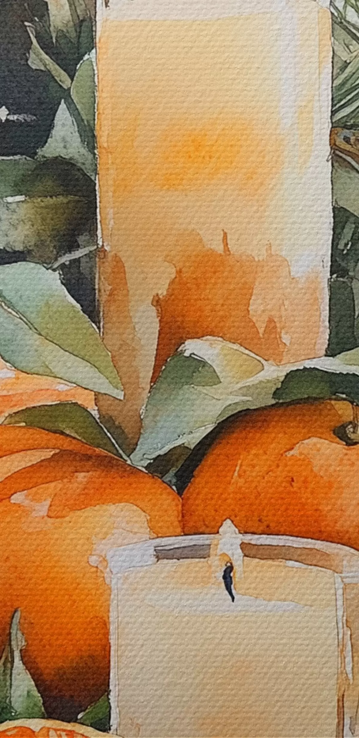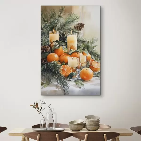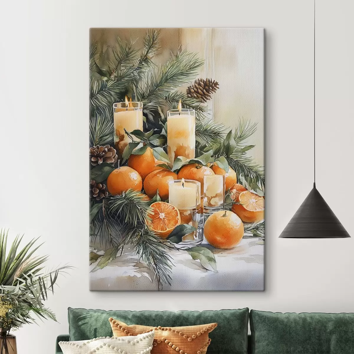 Maalid Männipuu oksad koos käbide, apelsinide ja küünaldega, pidulik, akvarellstiilis Nr s41956