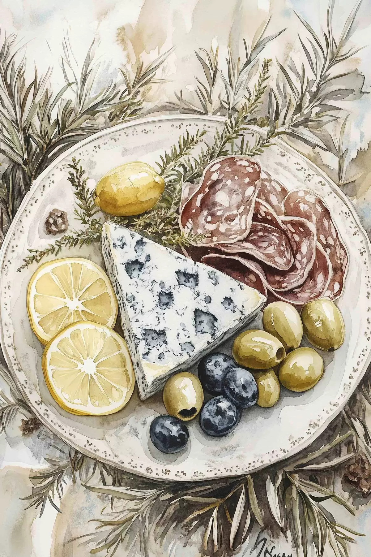 Maalid Akvarellistiilis taldrik maitsva toiduga, pidulik, sinihallitusjuust, salaami, oliivid, sidrun, männipuu Nr s41961