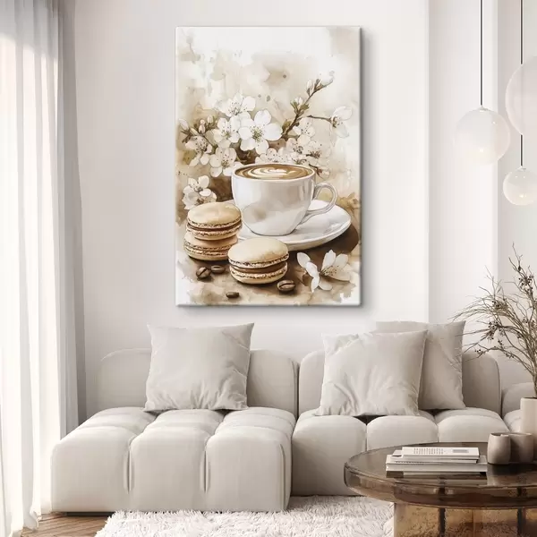 Maalid Makroonid, tass kohvi, akvarellistiil, beežid värvid, jasmiinililled Nr s41965