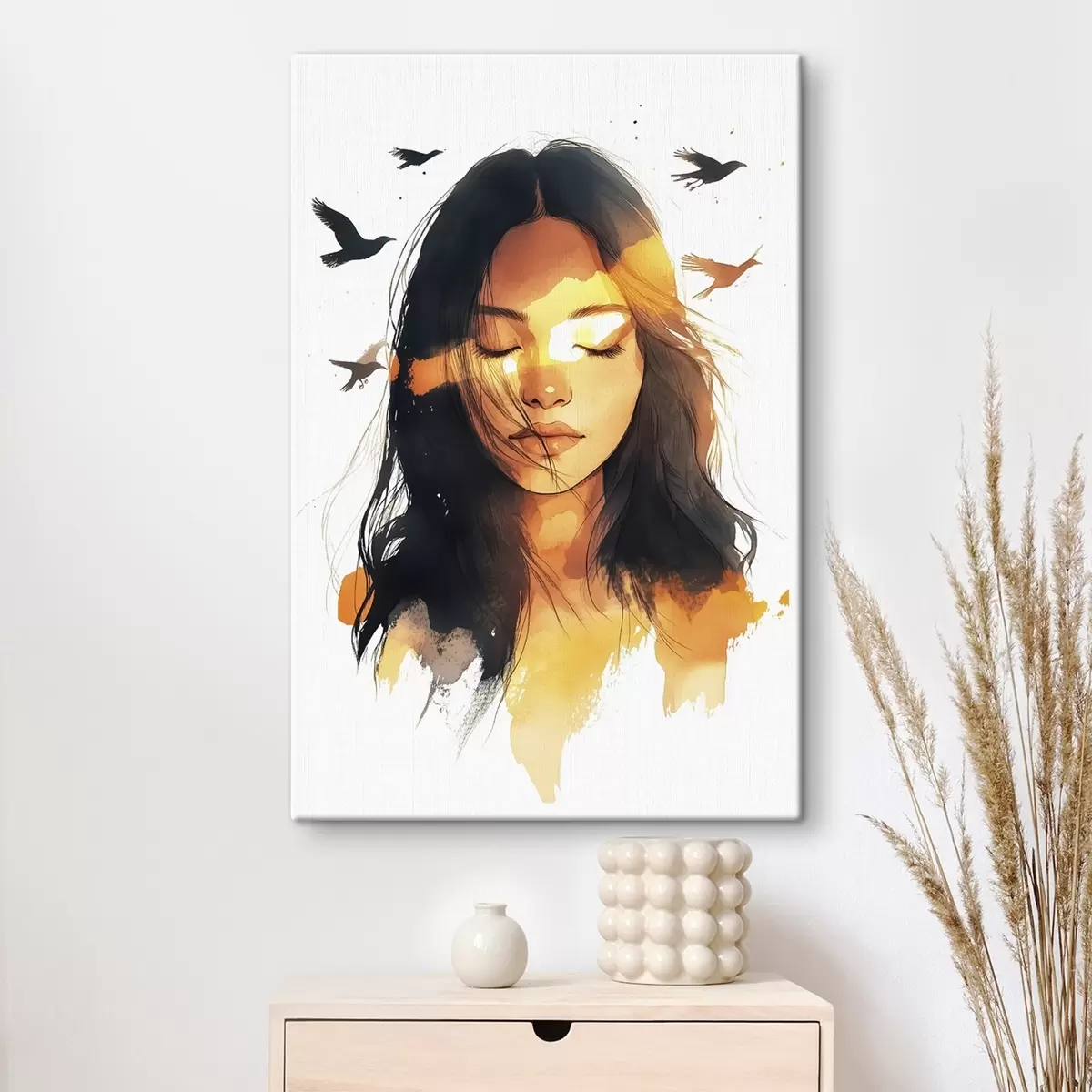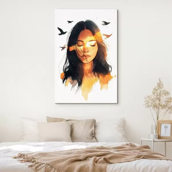 Maalid Akvarellstiilis portree, ilus tüdruk, päikesevalgus, lendavad linnud Nr s42198