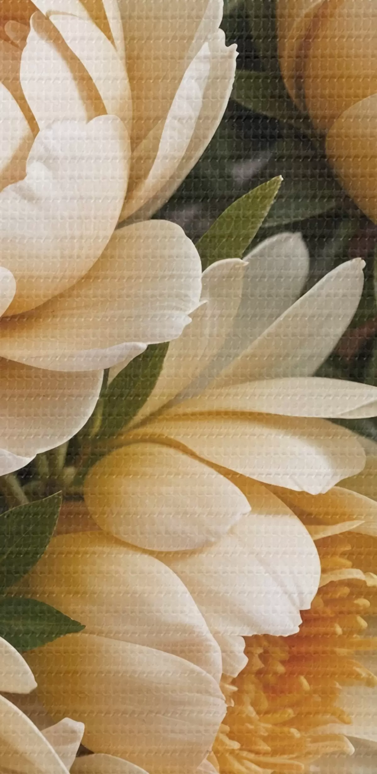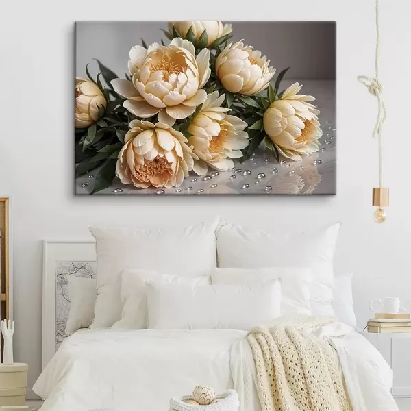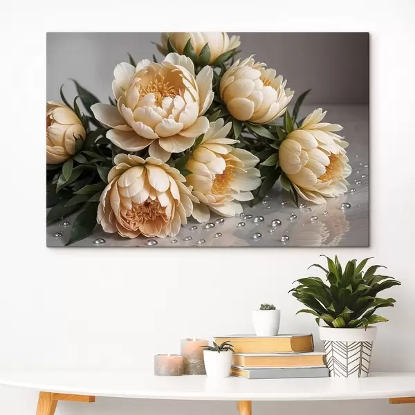Maalid Kreemjas üksikasjalikud pojengililled koos tumeroheliste lehtedega halli taustaga Nr s42215