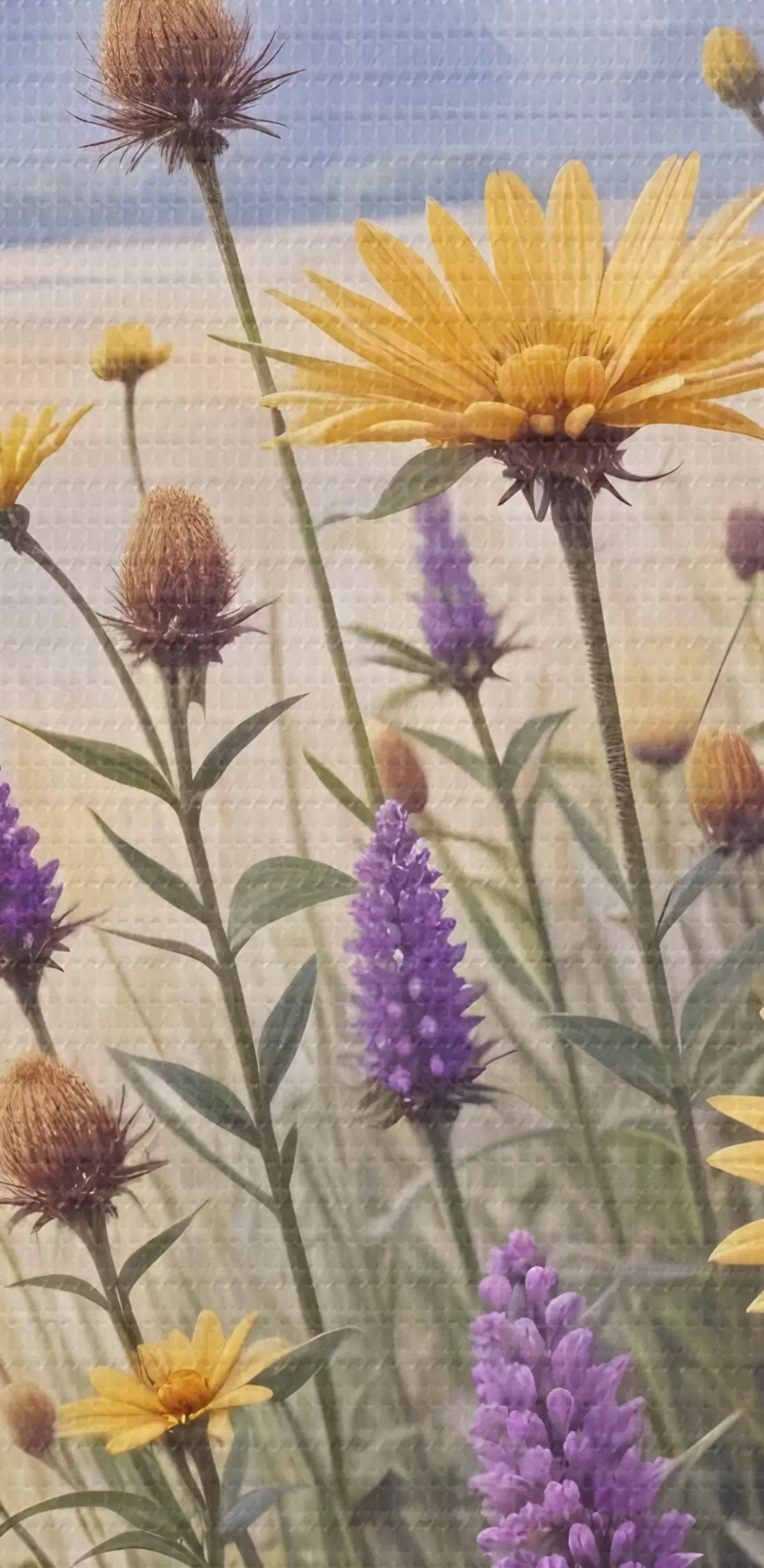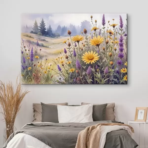 Maalid Kollaste päevalillede ja lillade metsalillede põld udusel metsamaastikul, taustaks mändid Nr s42223
