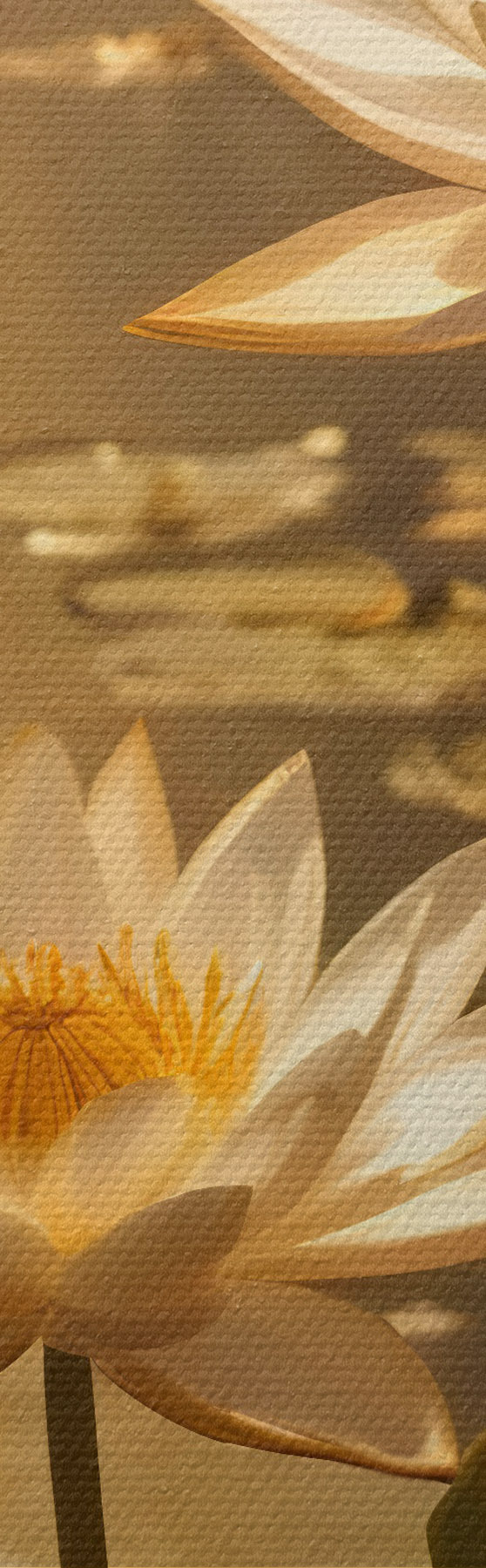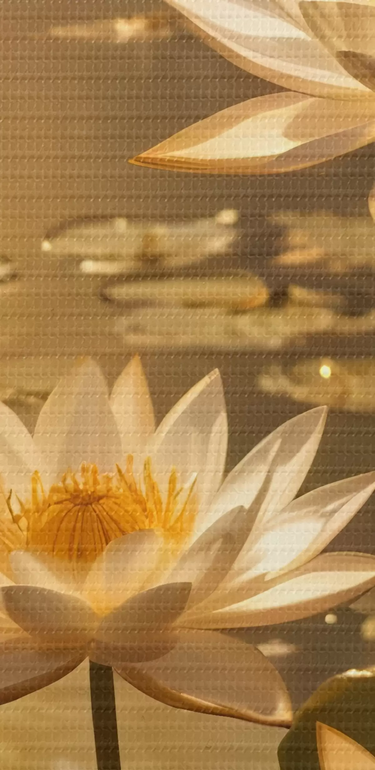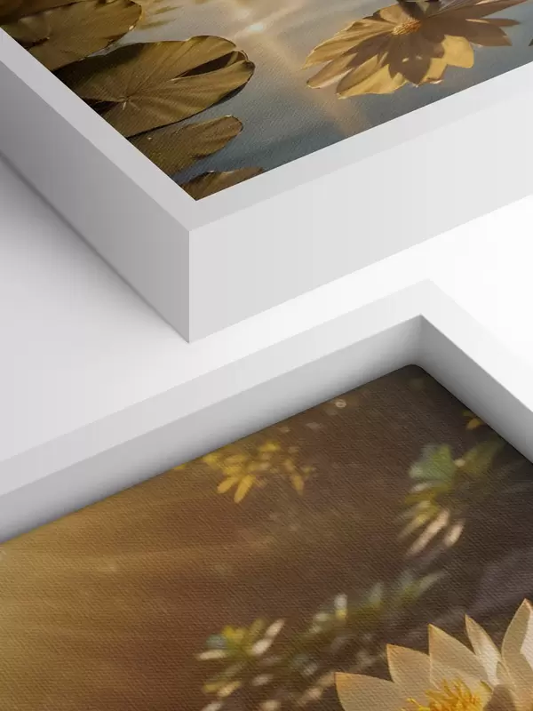 Maalid Valged lootoslilled hõljuvad rahulikul tiigil koos päikesega, luues rahulikku ja rahulikku atmosfääri Nr s42239