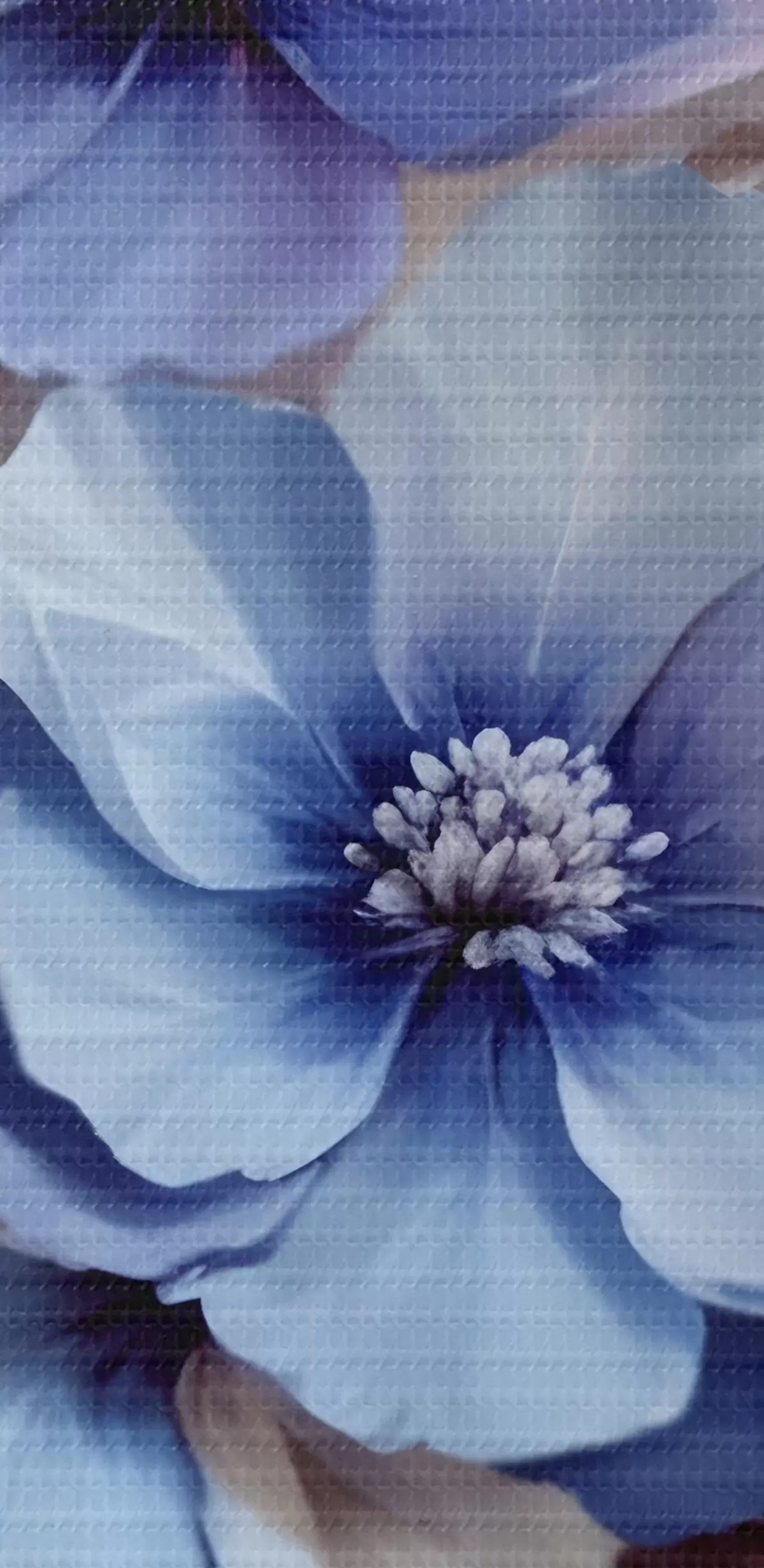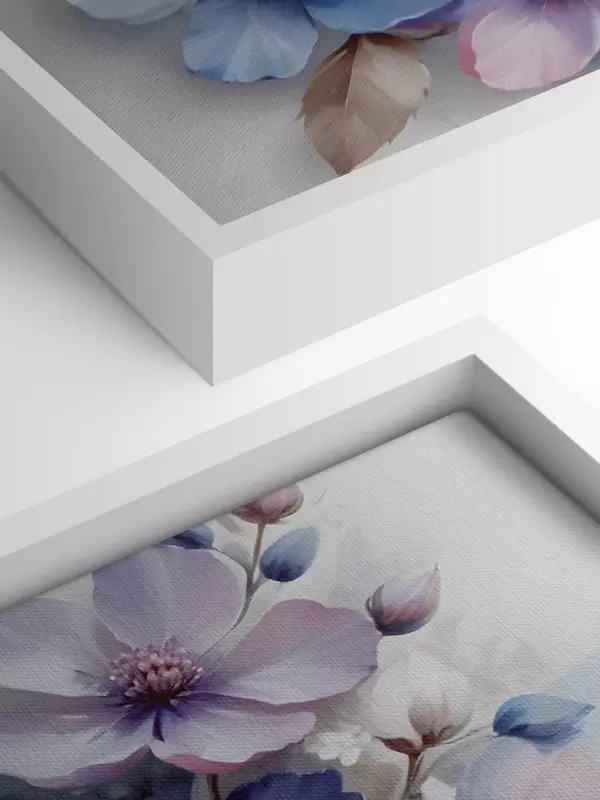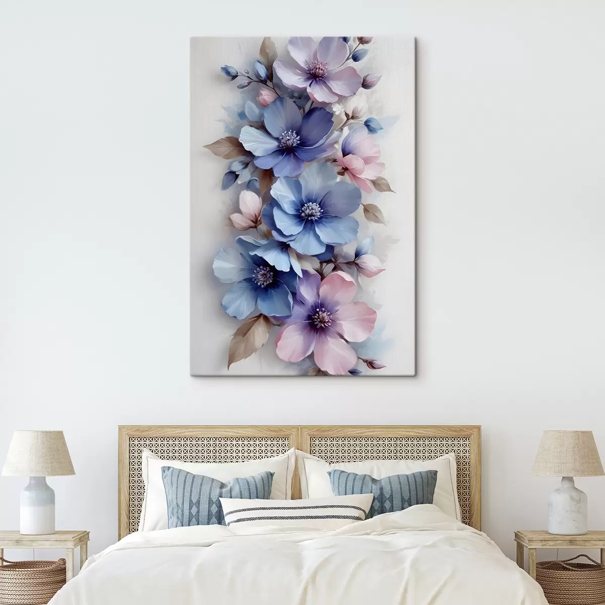 Maalid Õrnad sinised ja roosad õrnade kroonlehtede ja keskosaga lilled, mis on paigutatud kaunisse lilleprinti heledal taustal Nr s42241