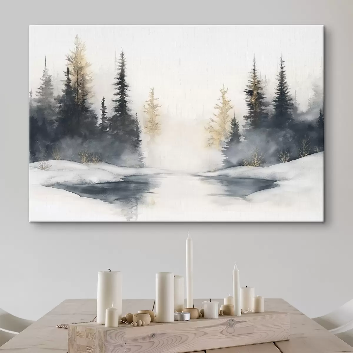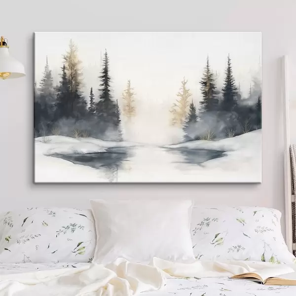 Maalid Talvine maastik jõe ja männipuudega, loodus, mets, udu Nr s42374