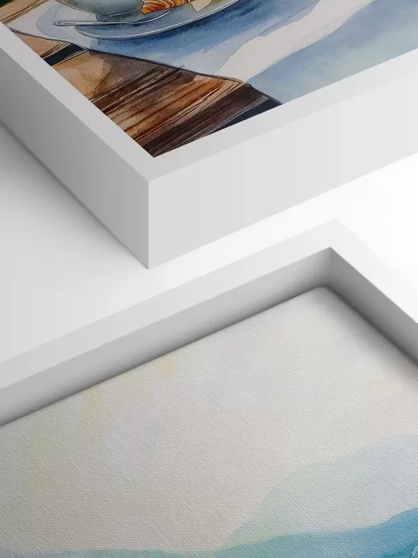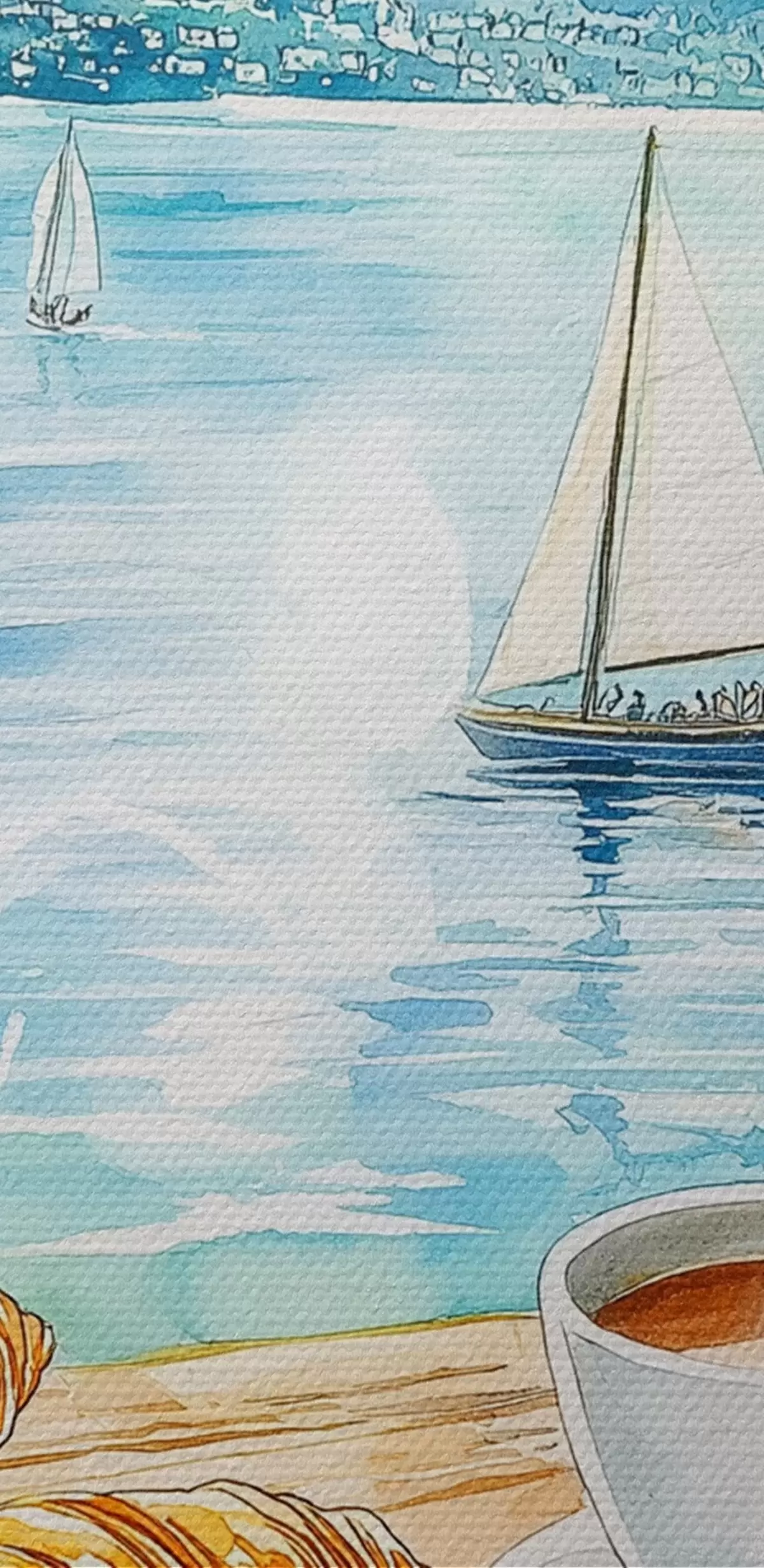 Maalid Suvine järv koos purjepaatidega, kohvitassid, croissants, akvarellstiilis Nr s42441