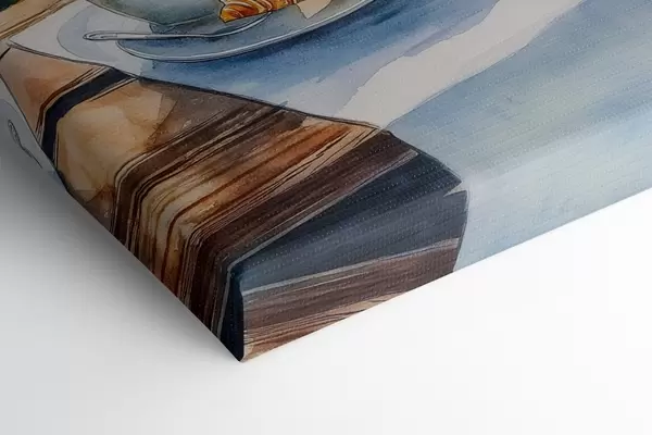 Maalid Suvine järv koos purjepaatidega, kohvitassid, croissants, akvarellstiilis Nr s42441