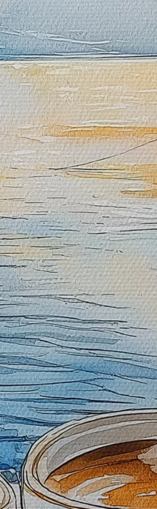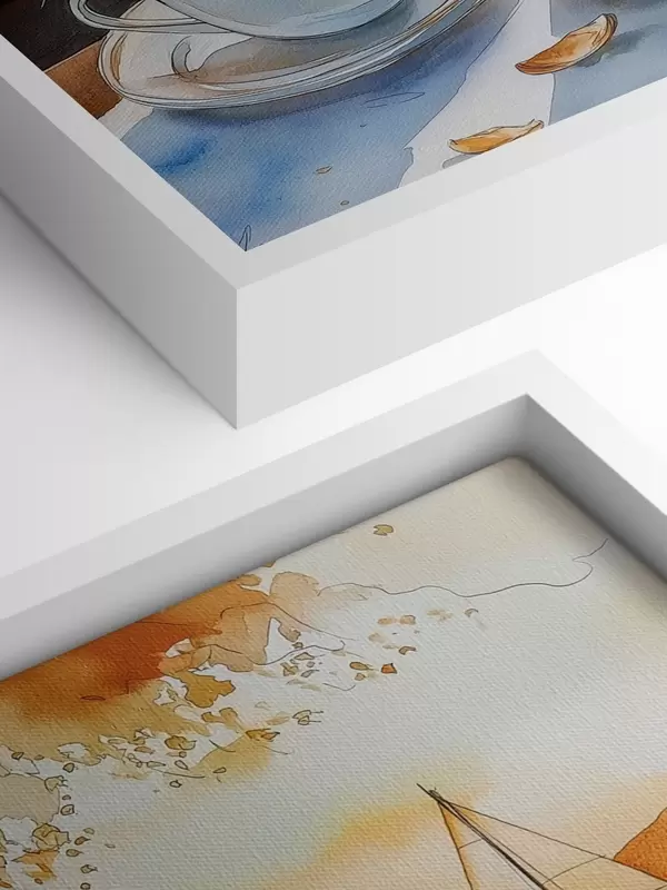 Maalid Päikeseloojang järvel, purjekad, kohvitassid, akvarellistiilis Nr s42442