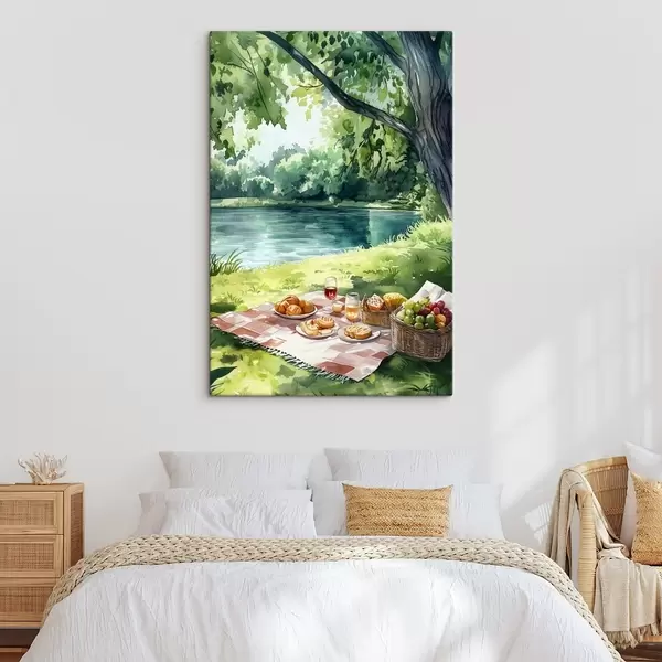 Maalid Kaunis romantiline piknik suvise järve ääres, puuviljad, rohelus Nr s42451