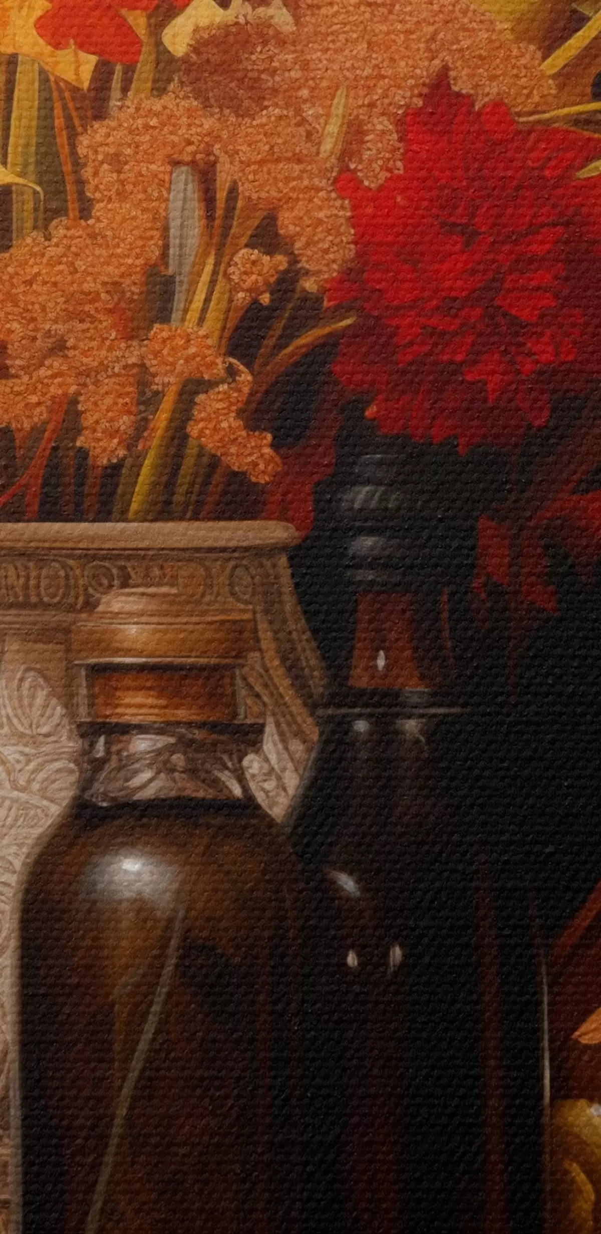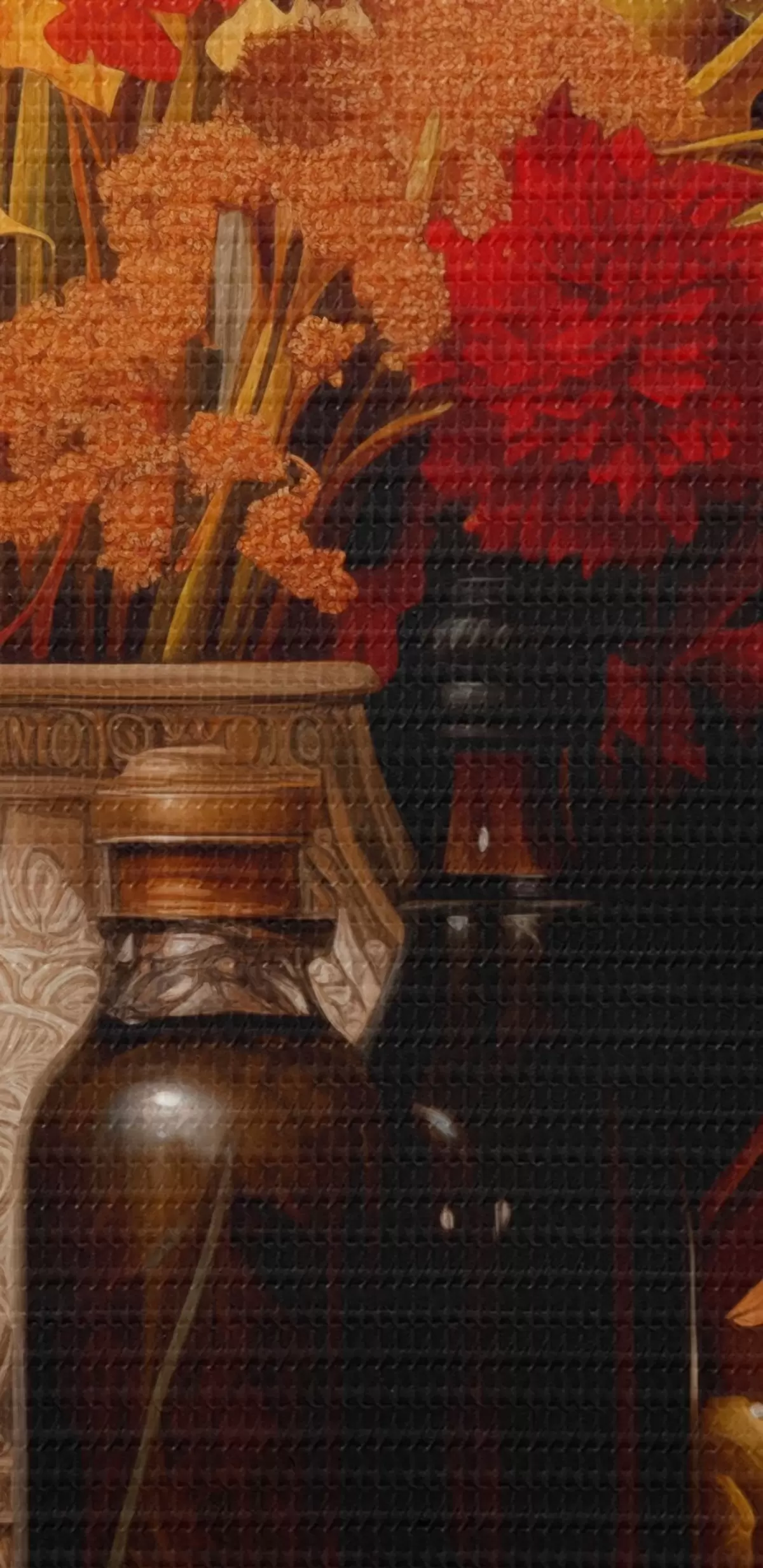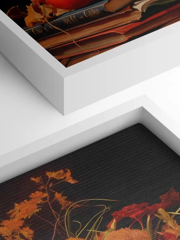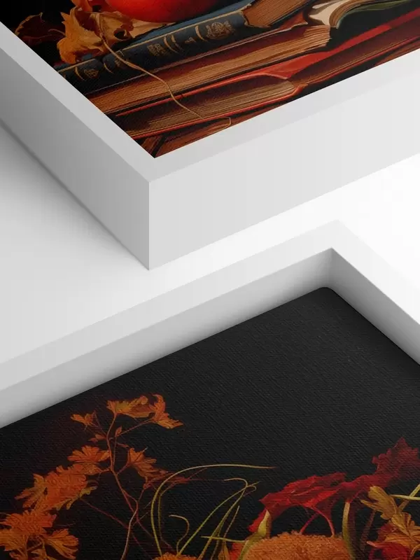 Maalid Sügisene vaatepilt, millel on tumedal taustal oranži ja punaste toonidega kimp, õunad, viinamarjad, raamatud ja keraamilised nõud. Nr s42561
