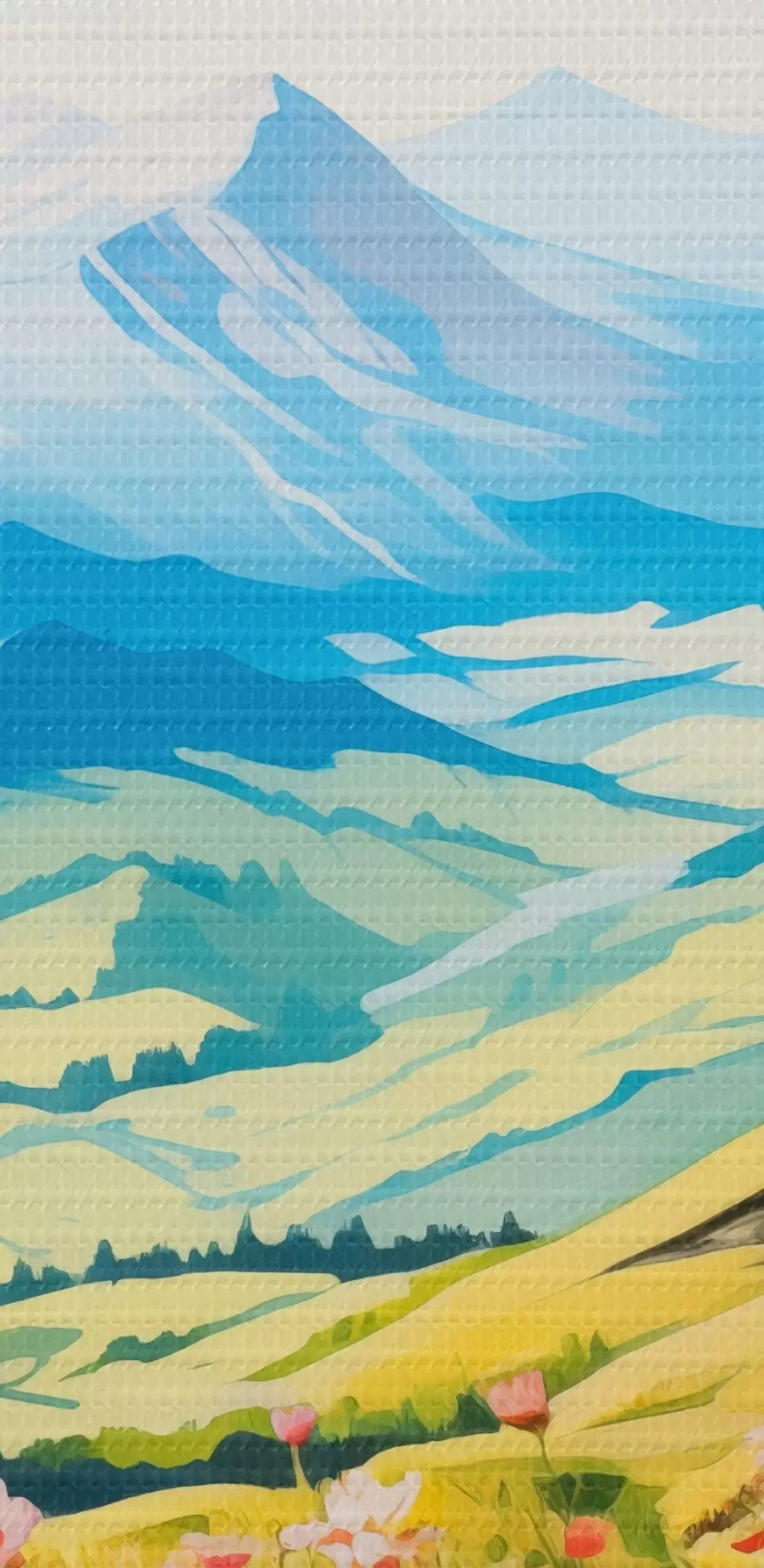 Maalid Elavat mägimaastikku, kus õitsevad niidud, rohelised künkad ja majesteetlikud tipud selge sinise taeva all. Nr s42565