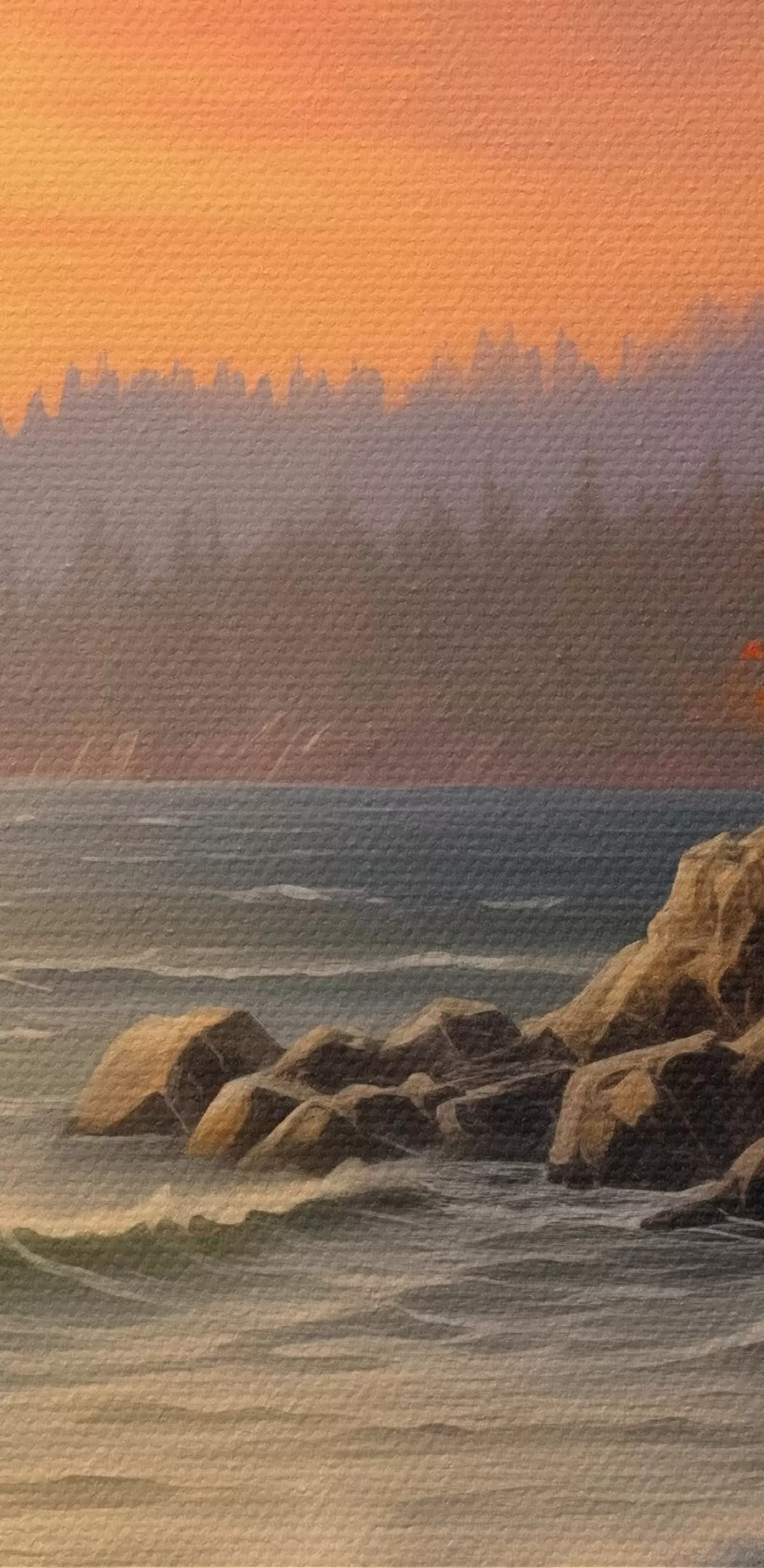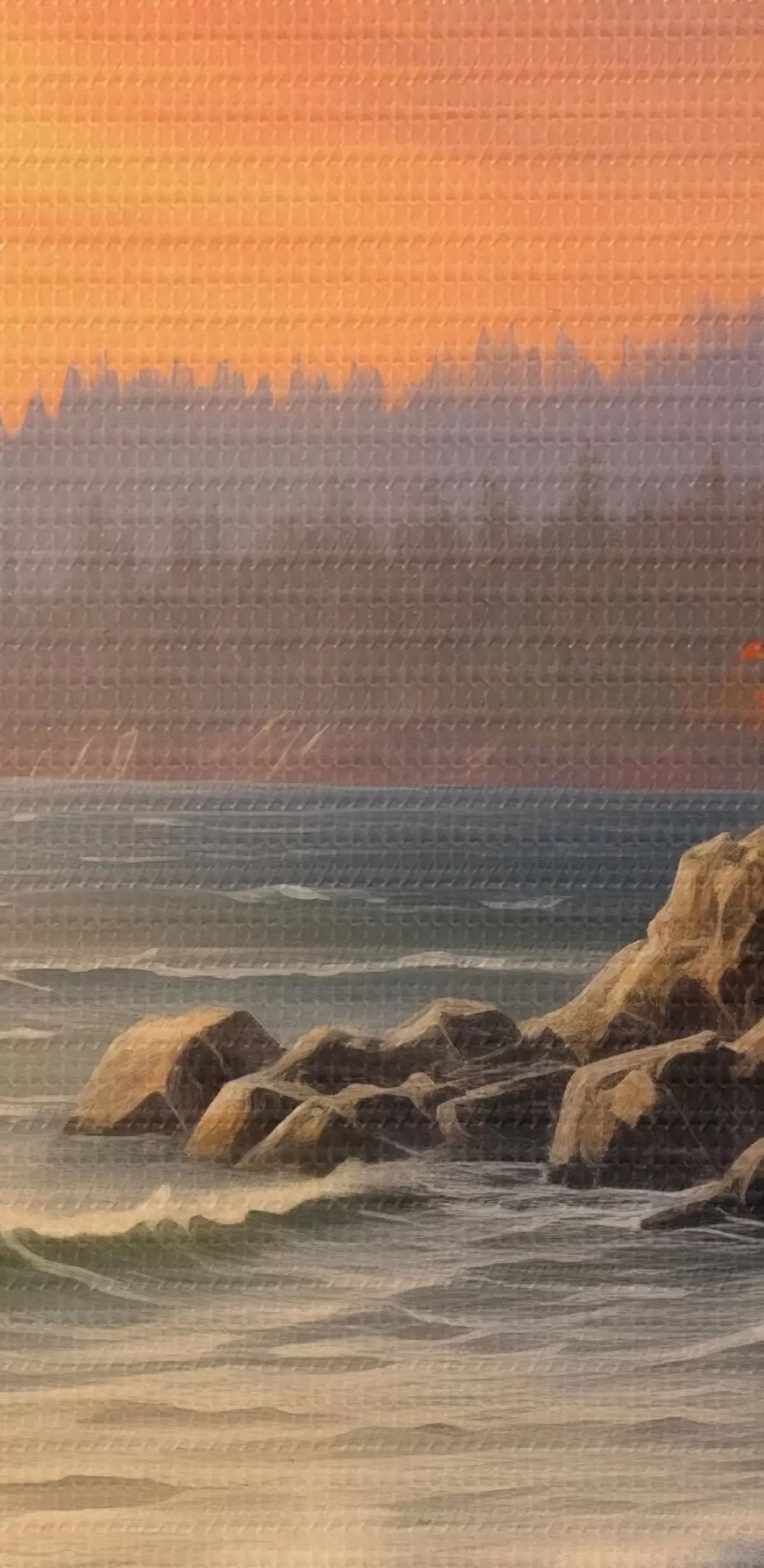 Maalid Päikeseloojang mere ääres koos lainete, männimetsa ja sügisvärvidega esiplaanil. Nr s42571
