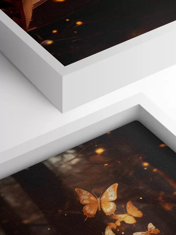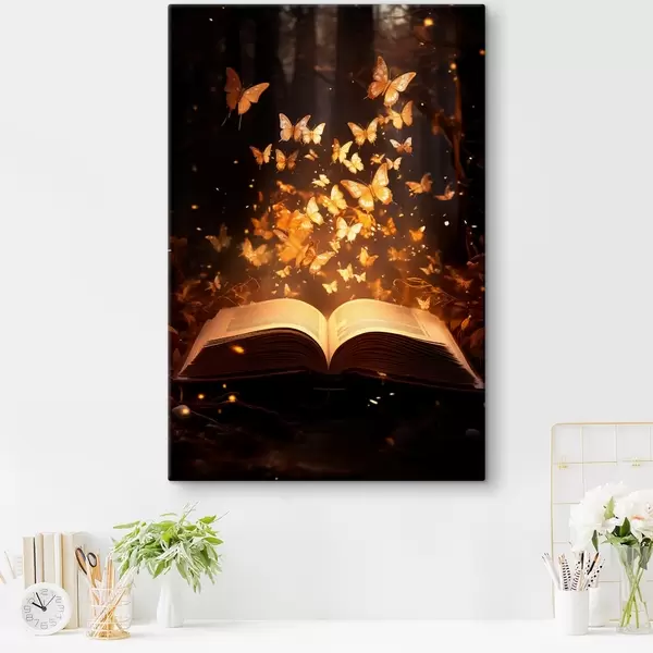 Maalid Avatud raamat, millest väljuvad helendavad liblikad, mis säravad valguskiirtes pimedas maagilises metsas. Nr s42573