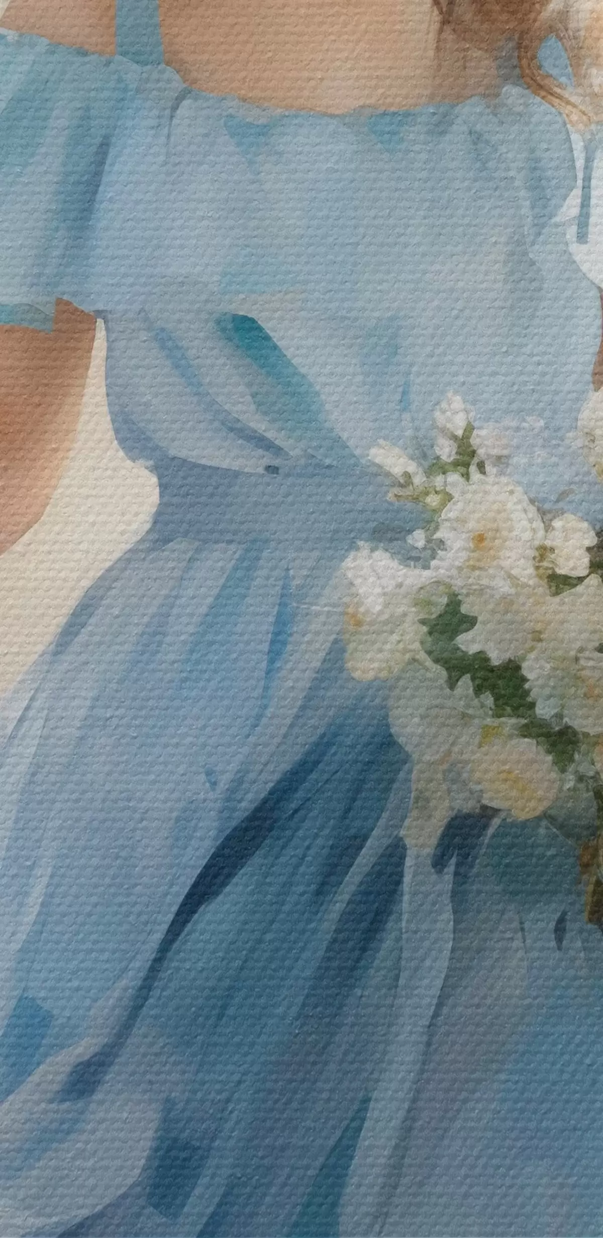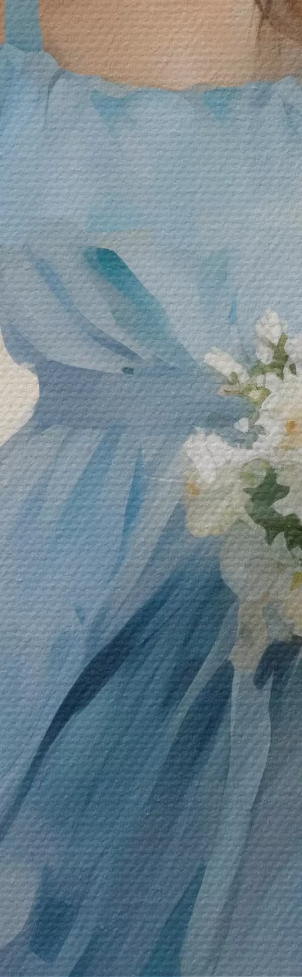 Maalid Elegantne tüdruk helesinises kleidis ja mütsis jalutamas läbi linna, käes lillekimp, kerge ja romantiline meeleolu. Nr s42580