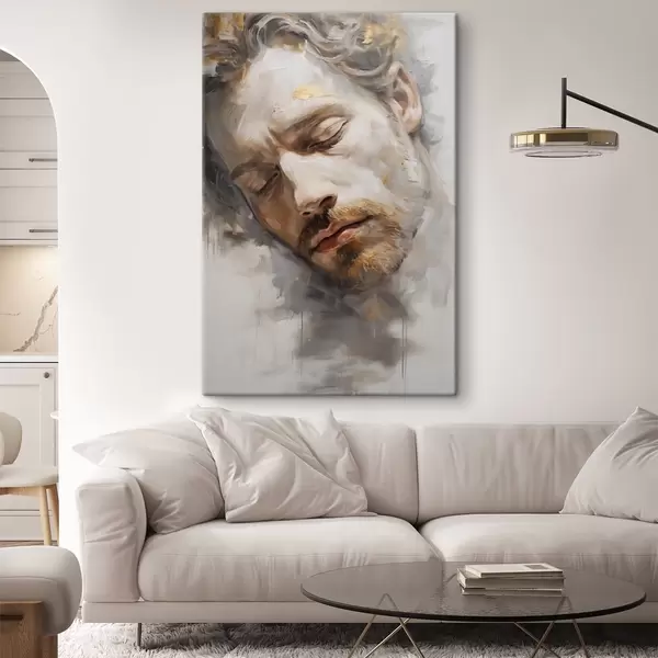 Maalid Abstraktne portree suletud silmadega mehest, mis on esitatud pehmete soojade toonidega ja sujuvate pintslitõmmetega, mis tekitavad rahuliku tunde. Nr s42621
