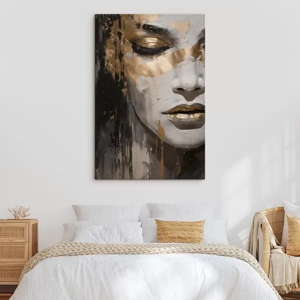 Maalid Abstraktne portree naisest, rõhutades suletud silmi ja huuli, mis on teostatud must-valgetes toonides dünaamiliste soojade pintslitõmmetega Nr s42626