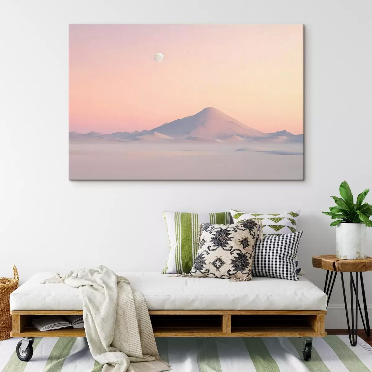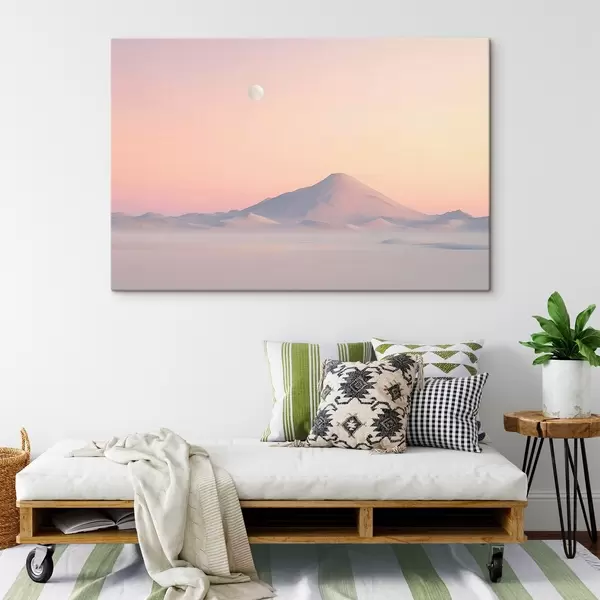Maalid Pehmete pastelsete värvidega suur mägi õrna nõlvaga, kus taevas on näha kahvatu kuu Nr s42718