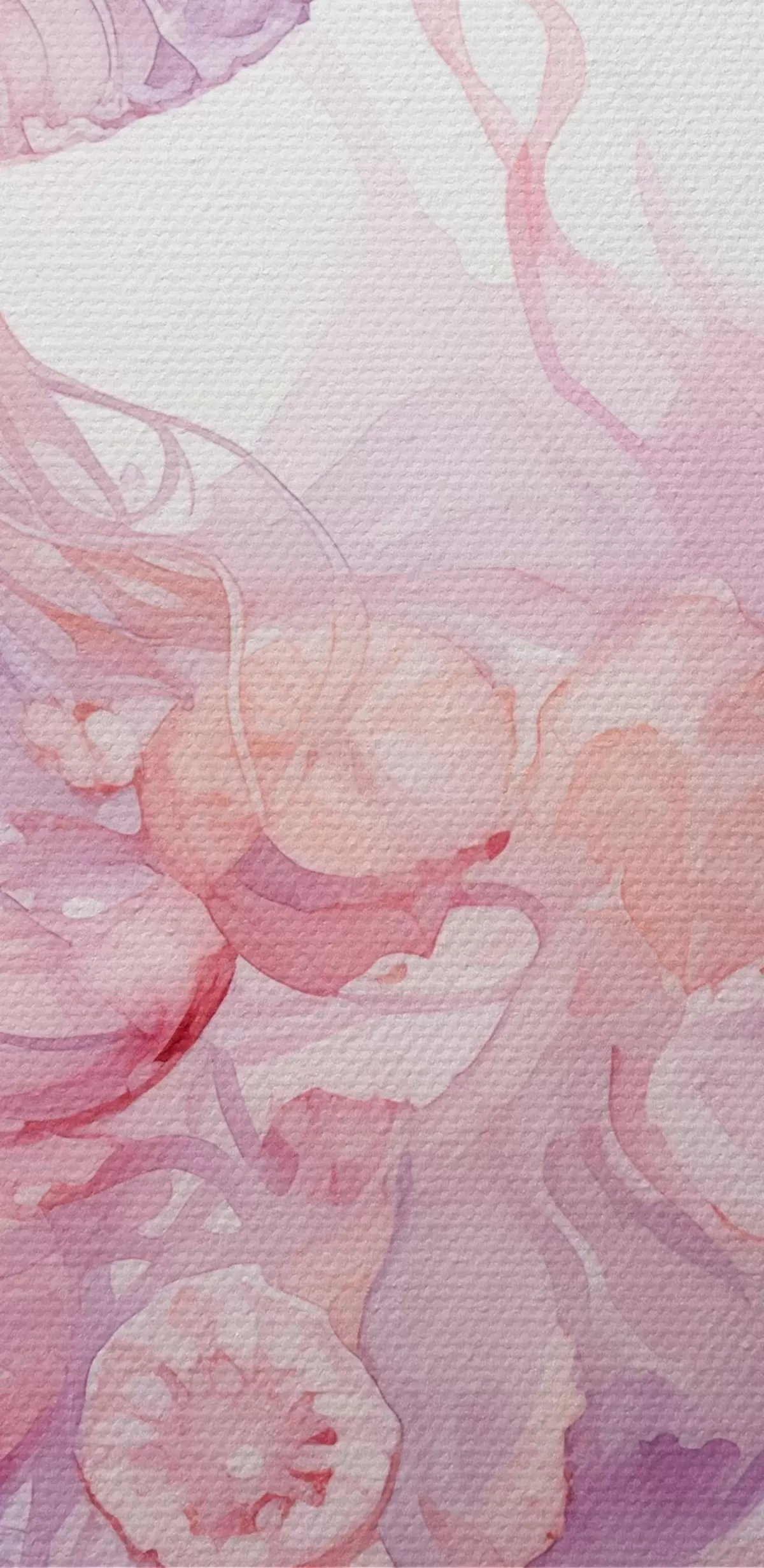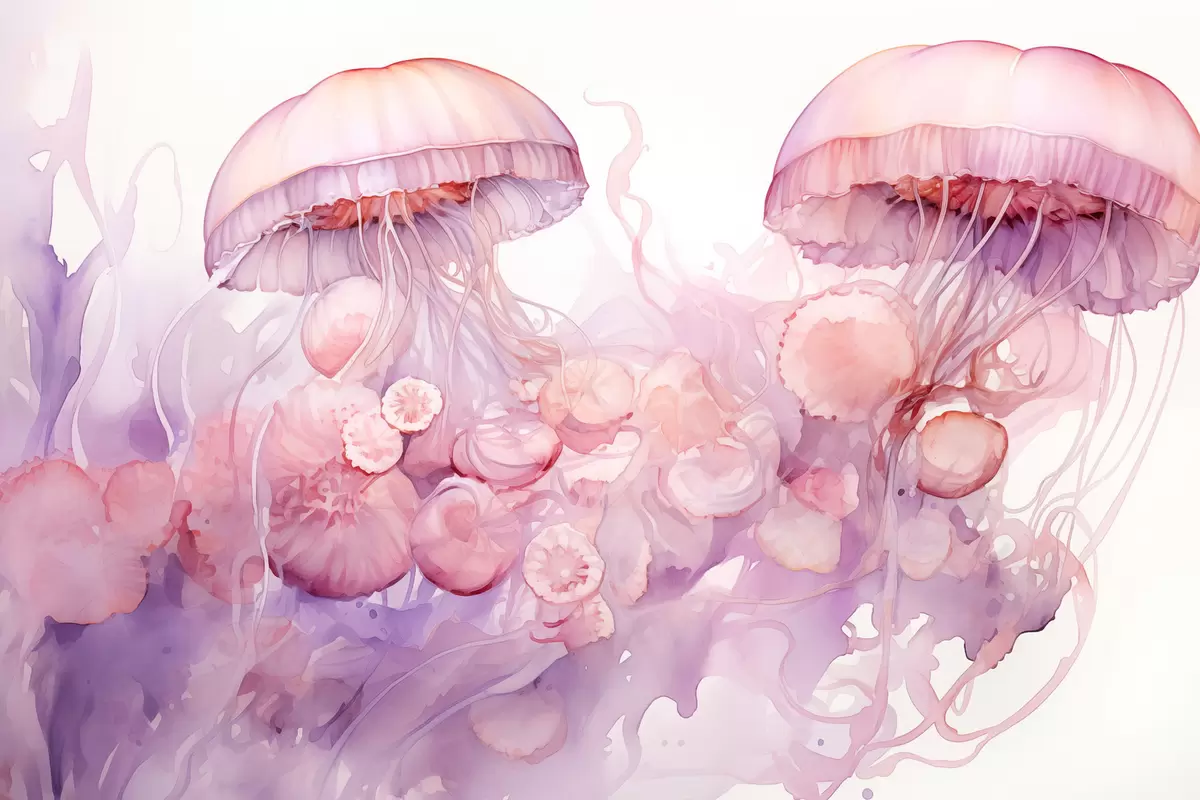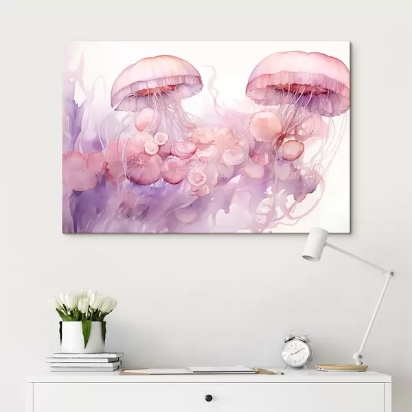 Maalid Roosa meduus, mis hõljub pehmete roosade ja lillade toonide keerises, ümbritsetud abstraktsete kujunditega Nr s42730
