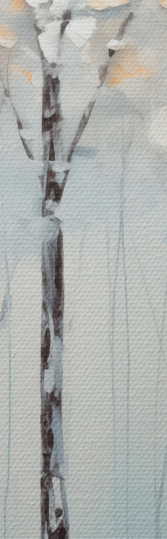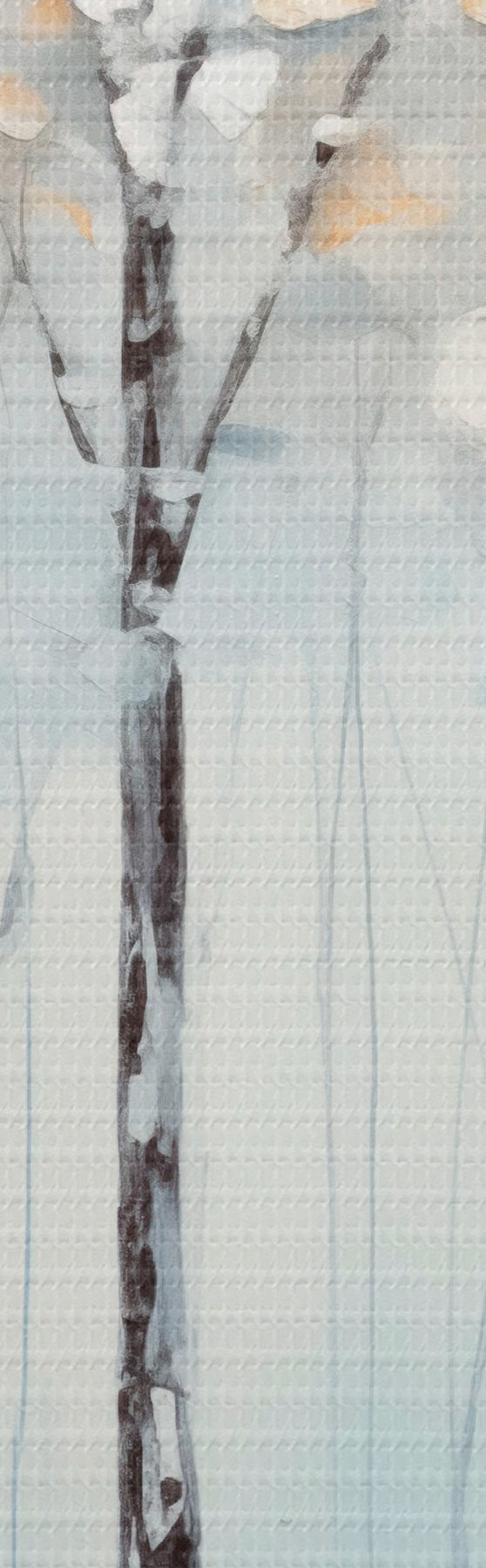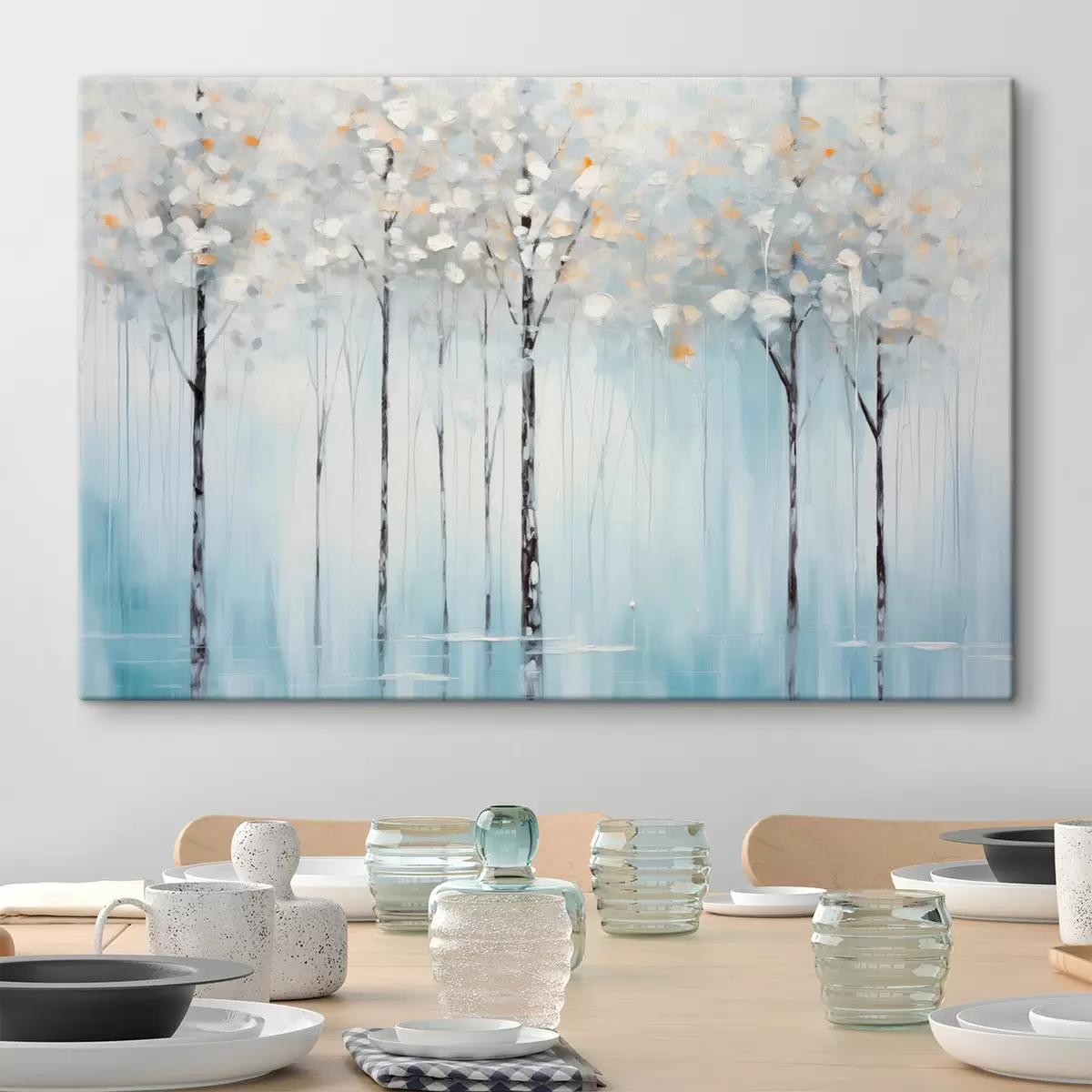 Maalid Kõrged, sihvakad puud siniste lehtedega ja kollaste vihjetega pehmel sinisel taustal, õlimaali jäljendus Nr s42731