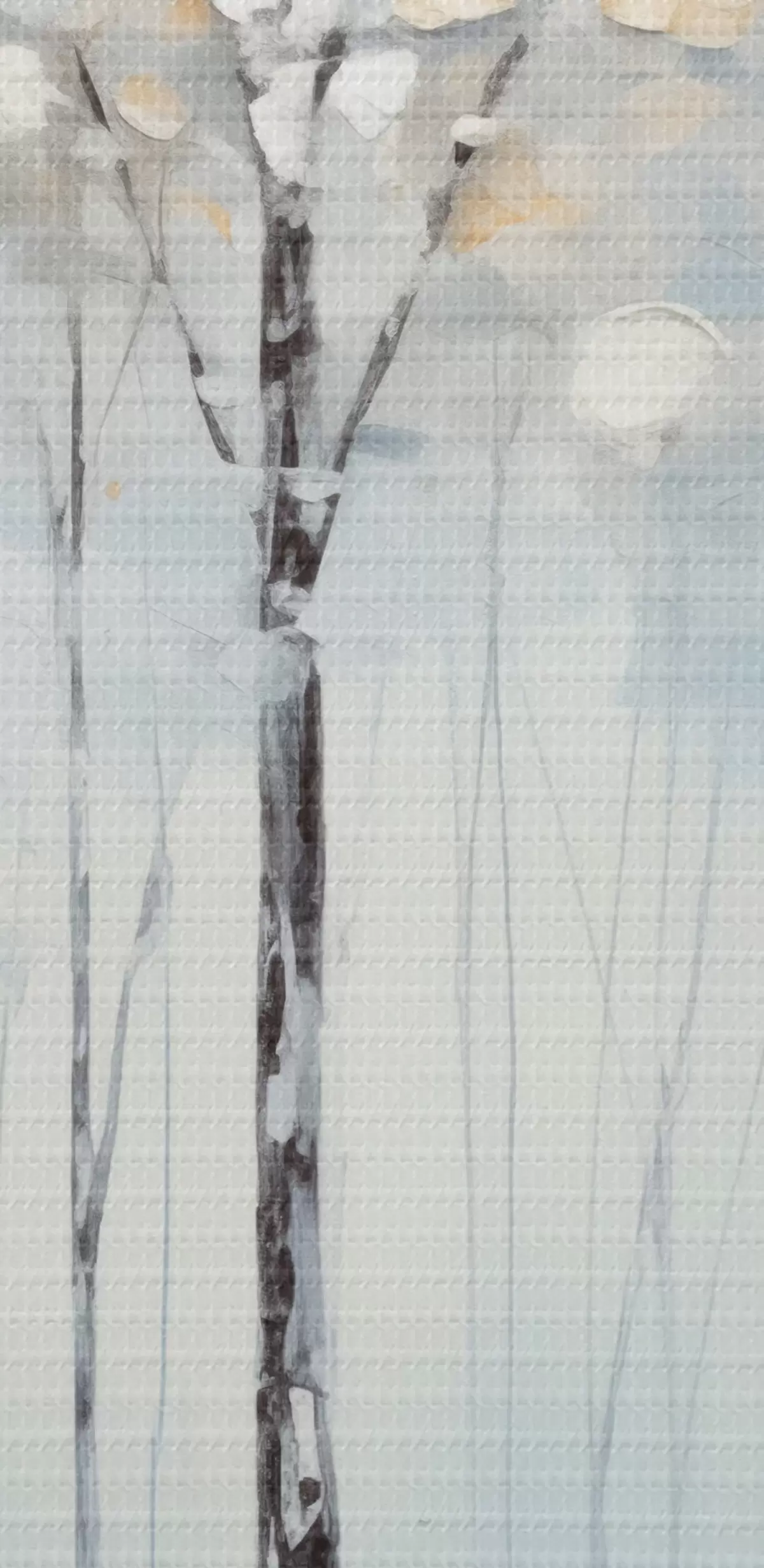 Maalid Kõrged, sihvakad puud siniste lehtedega ja kollaste vihjetega pehmel sinisel taustal, õlimaali jäljendus Nr s42731