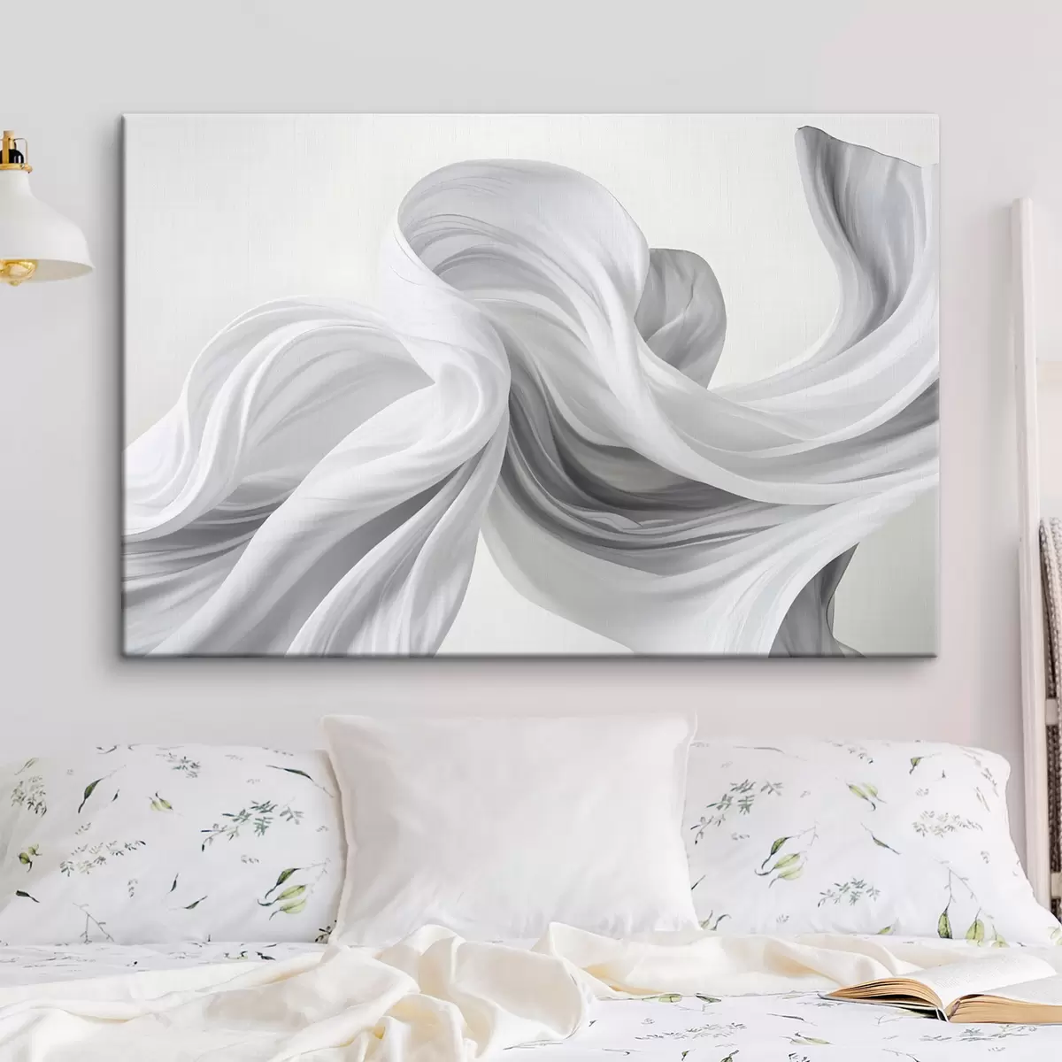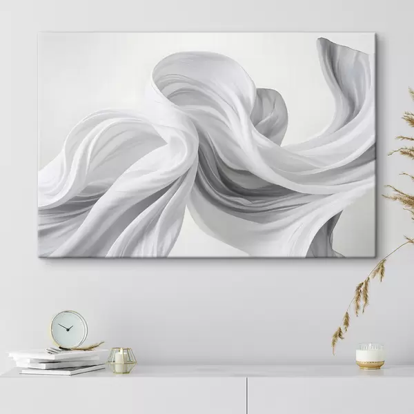Maalid Voolavad valged ja hallid kangasekujulised vormid, mis keerlevad ja põimuvad heledal taustal Nr s42732