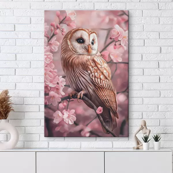 Maalid Öökull kirsipuu peal, roosad lilled, realism, loodus Nr s42785