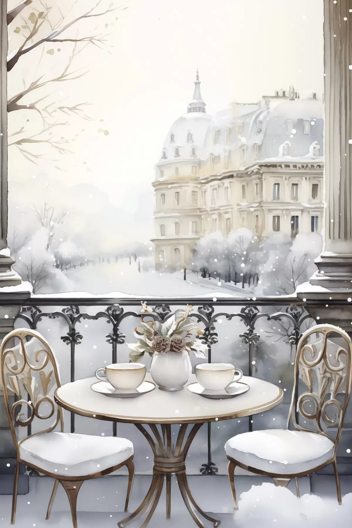 Maalid Kaunis kohvik, tassid teed, boheemlaslik stiil, akvarell, talvine esteetika Nr s42796