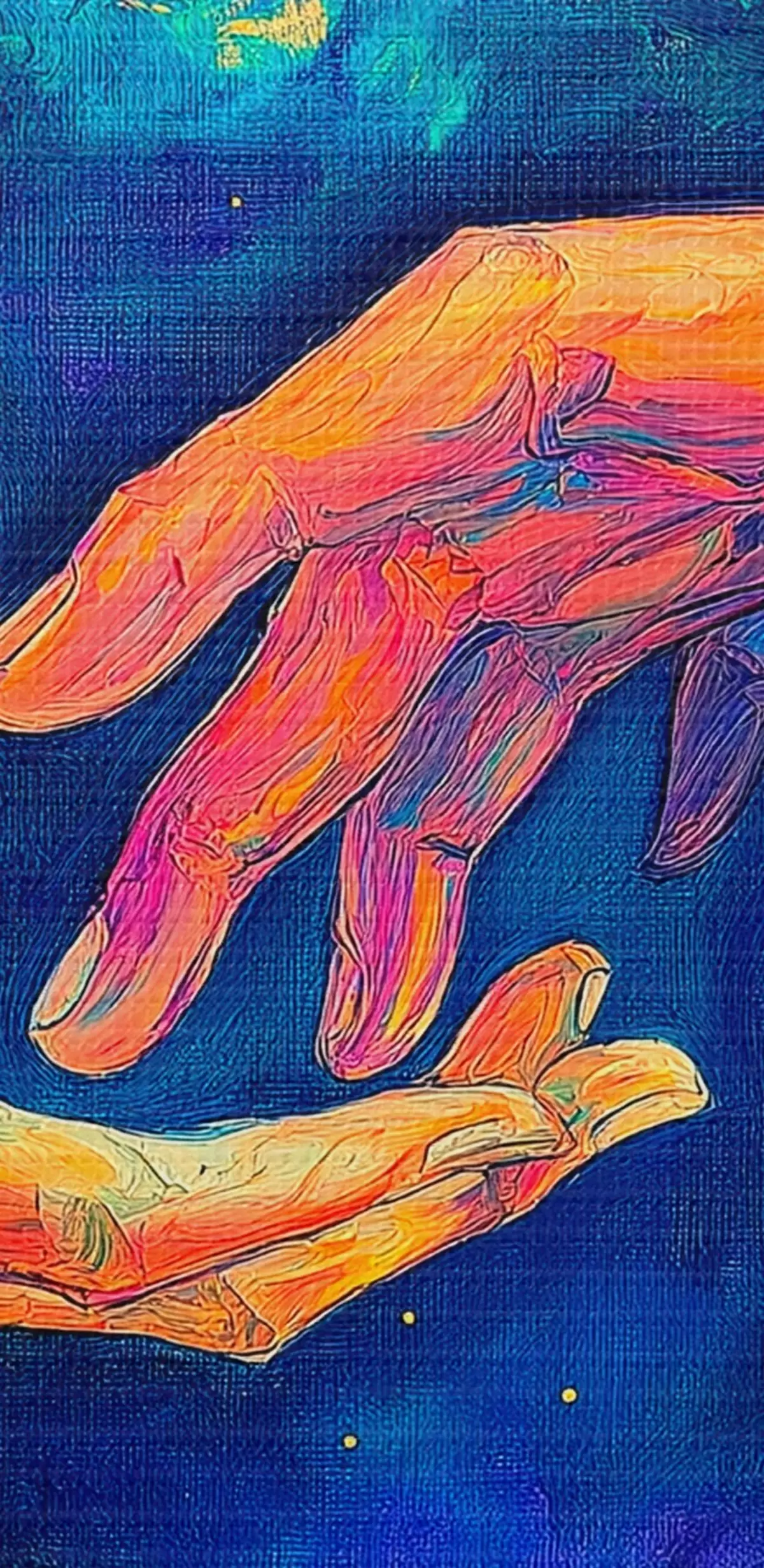 Maalid Abstraktne kompositsioon kahest käest, mis ulatuvad üksteise poole, elava värvipaleti kosmilisel taustal Nr s42937