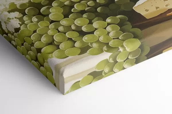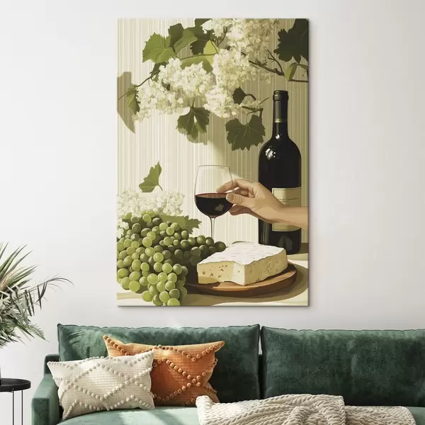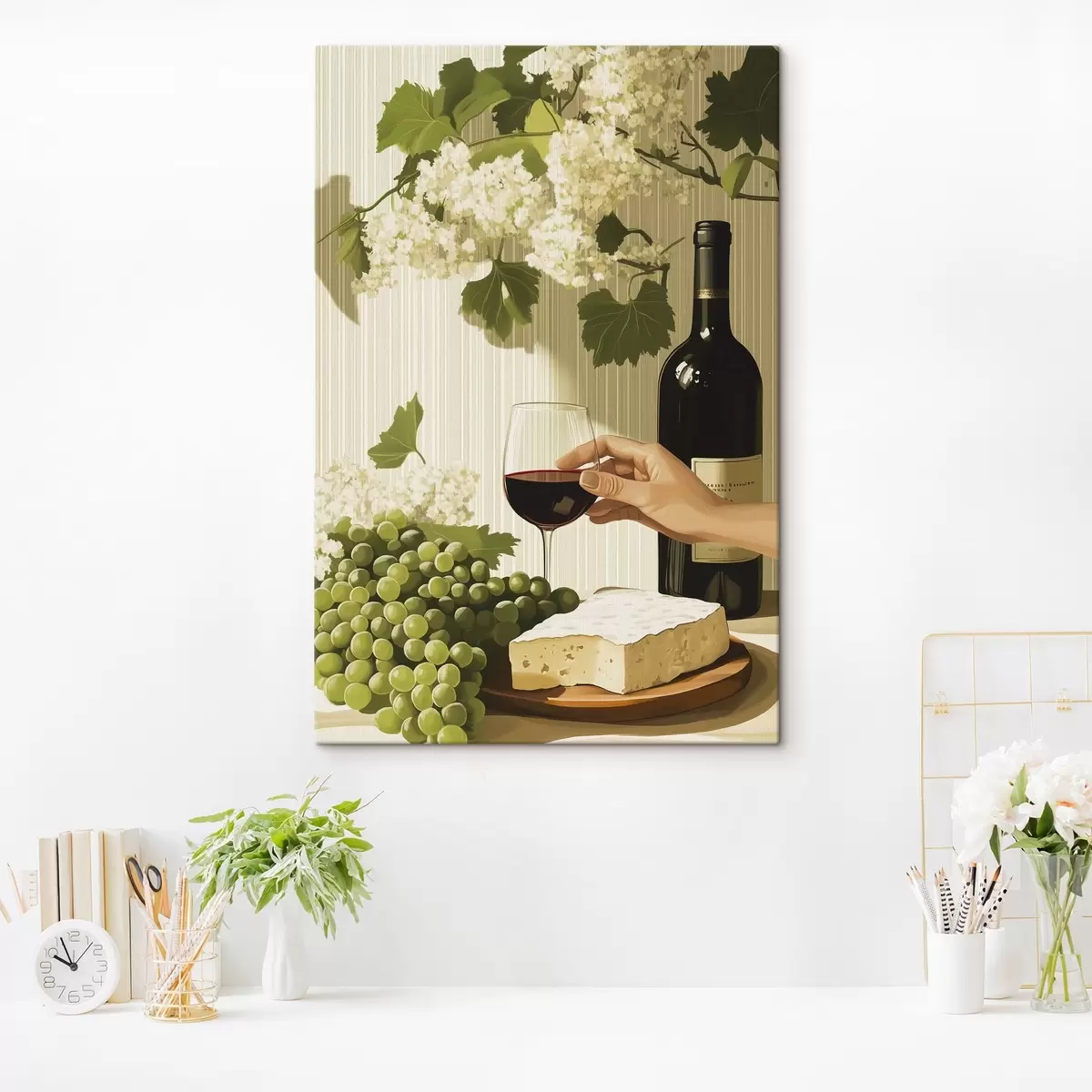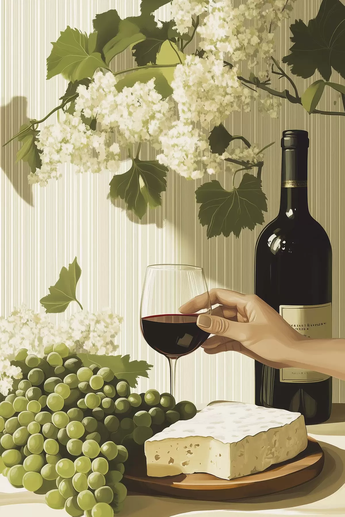 Maalid Viinamarjad juustuga, pudel veini, vintage stiilis, valged lilled Nr s43052