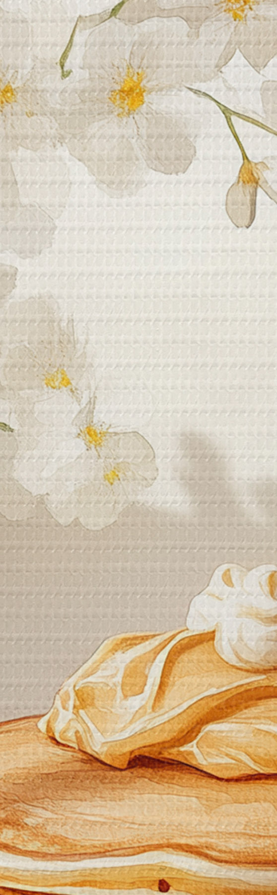 Maalid Maitsvad pannkoogid maapähklivõiga, akvarellistiilis, vaas valgete lilledega Nr s43063