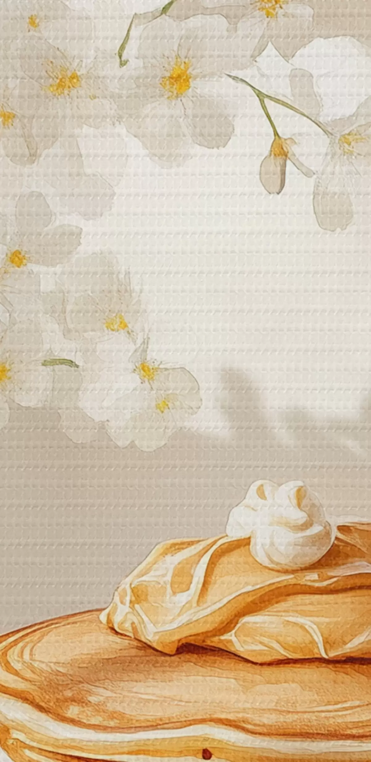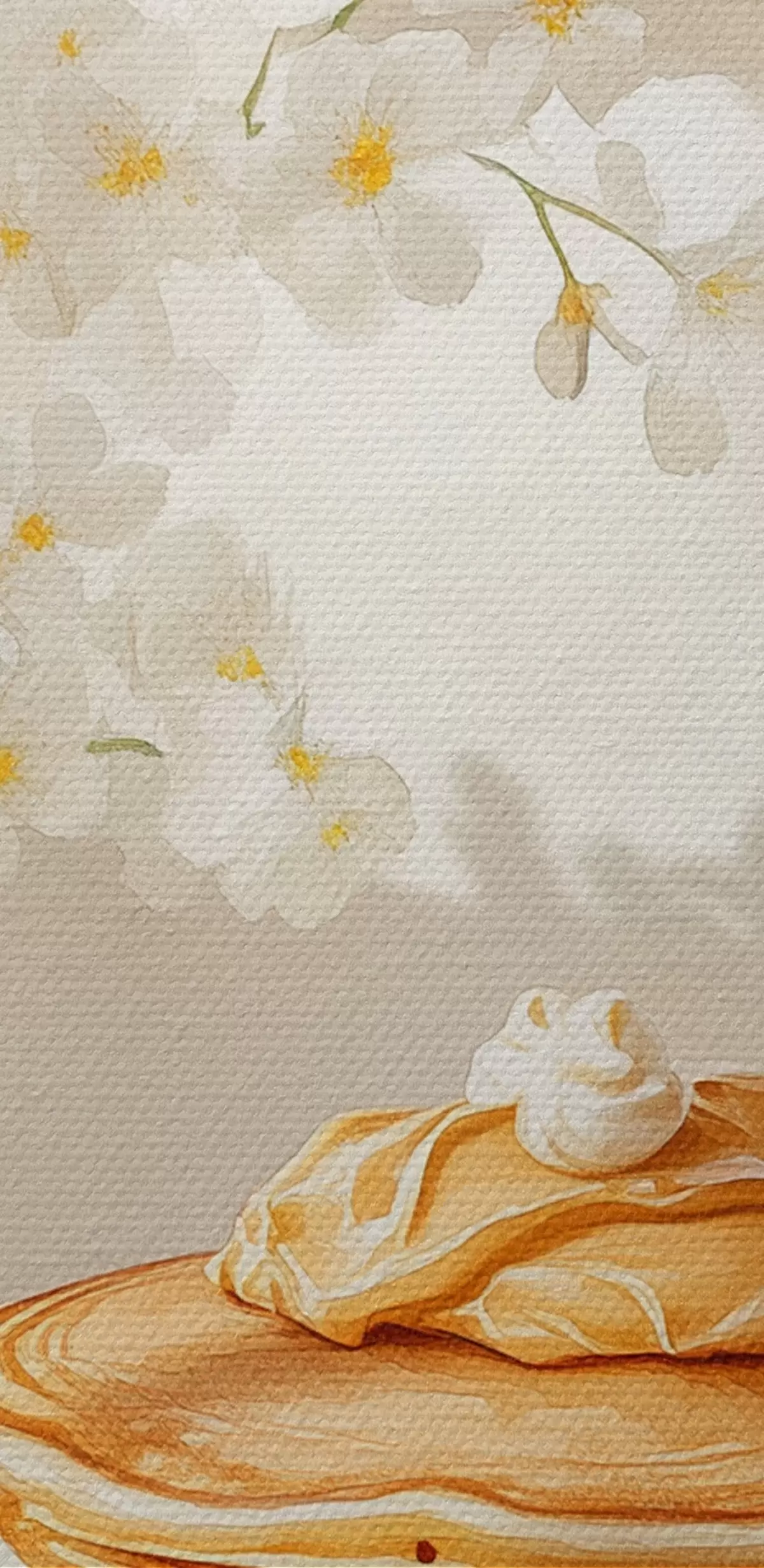 Maalid Maitsvad pannkoogid maapähklivõiga, akvarellistiilis, vaas valgete lilledega Nr s43063