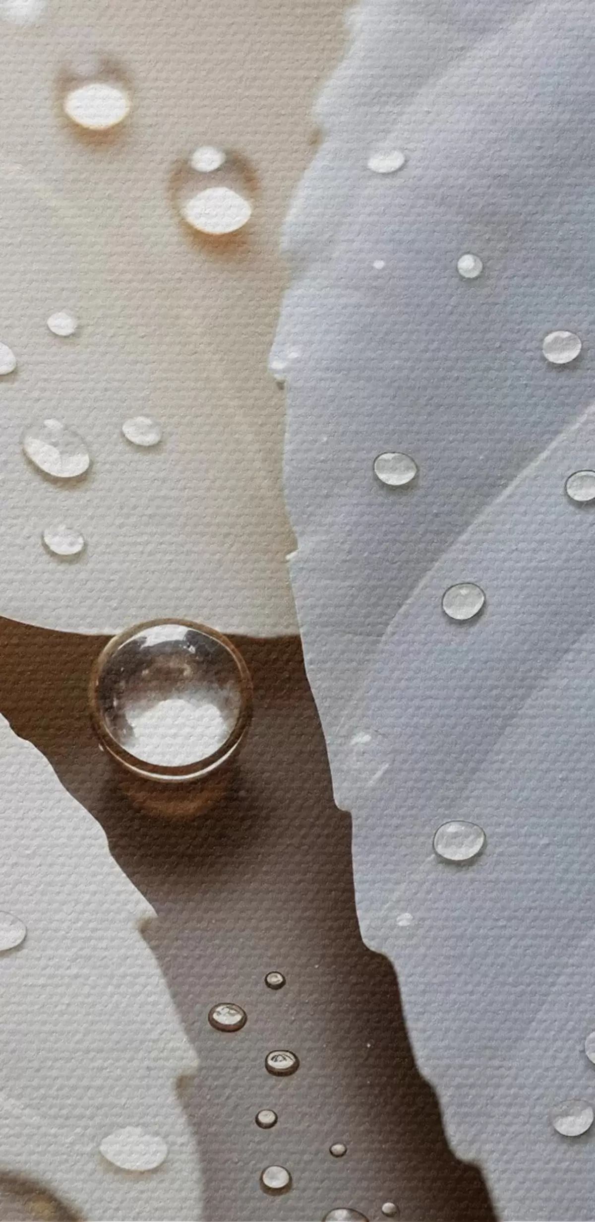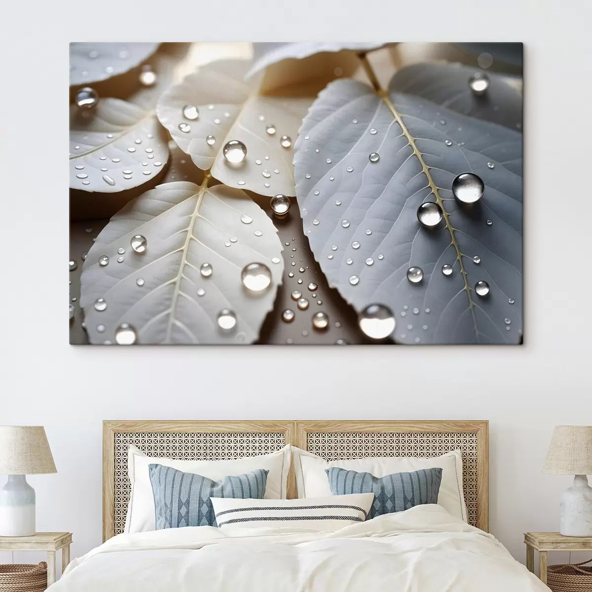 Maalid Lähivõtte valgetest lehtedest, mis on kaetud veepiiskadega, minimalistlik kompositsioon, neutraalne taust Nr s43159