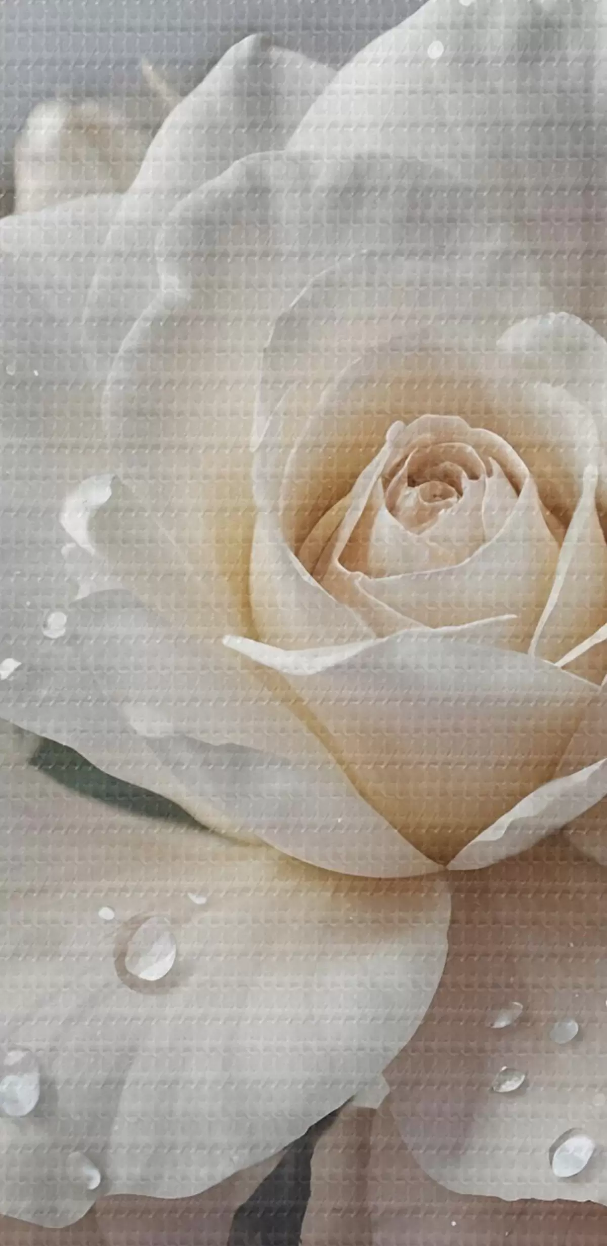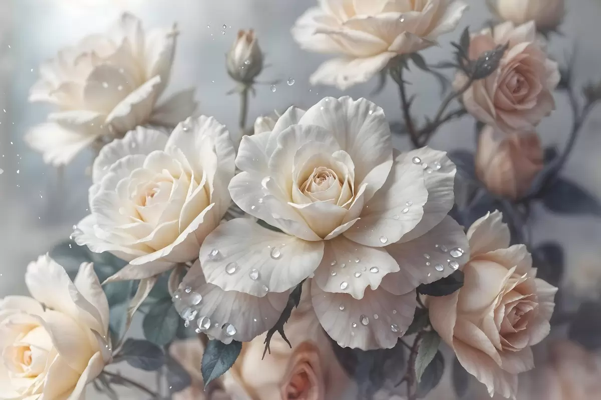 Maalid Rühm valgeid roose, mille kroonlehtedel on veetilgad, mõned rohelised lehed, summutatud taust, pehme valgus Nr s43163