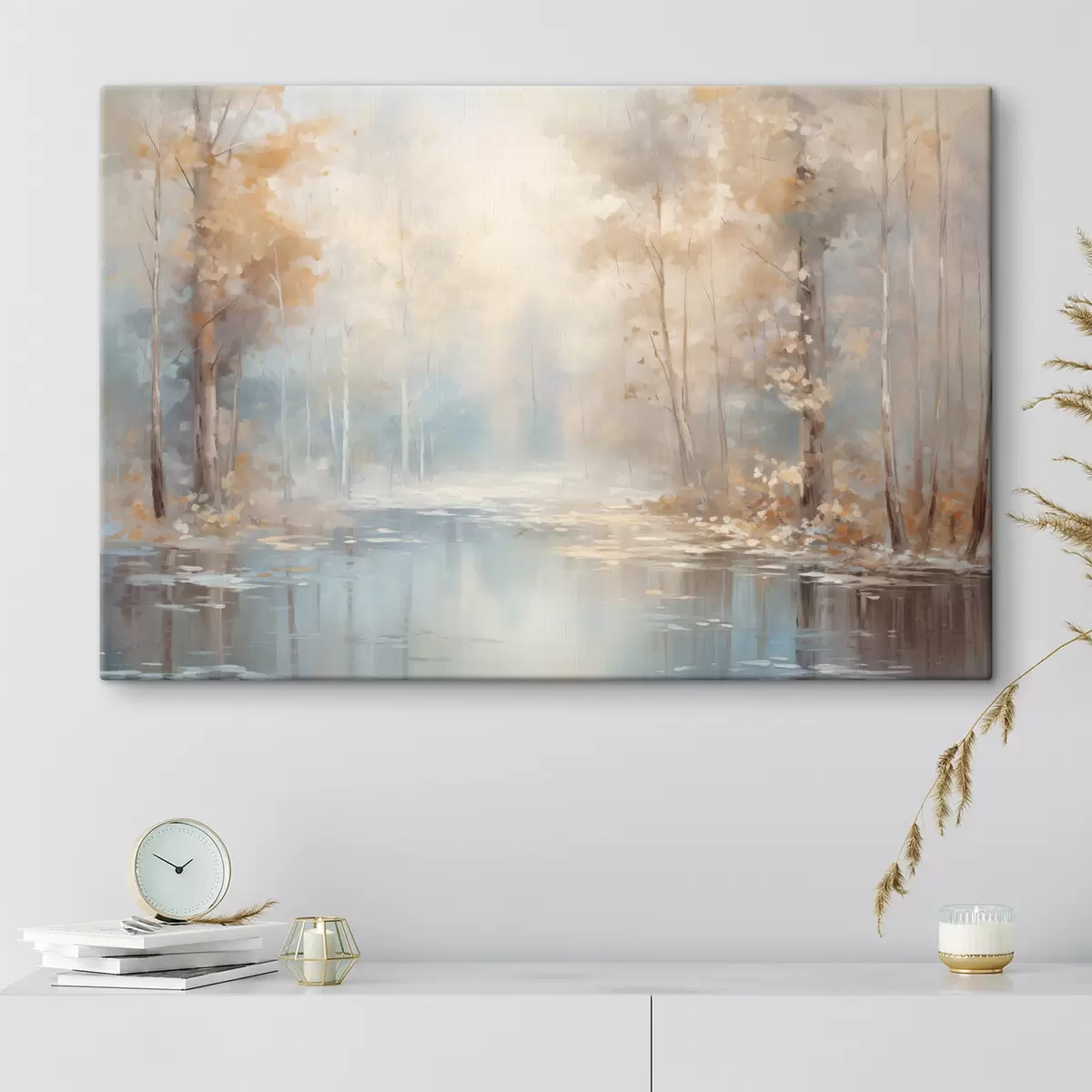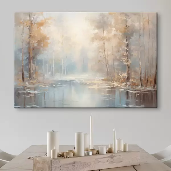 Maalid Maastik õlimaal imitatsioon rahulikust jõest, mis peegeldab pehmet valgust, mida ümbritsevad sügisesed puud Nr s43167