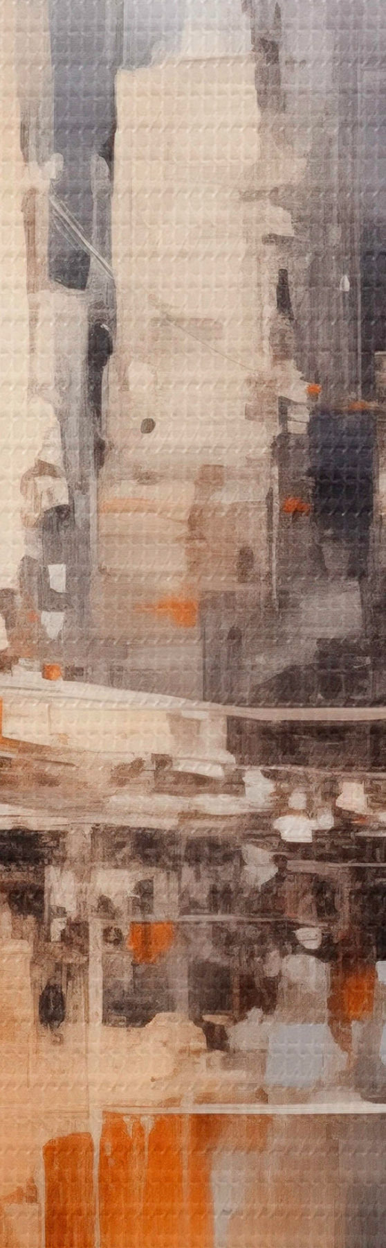 Maalid Abstraktne linnapilt, kus kõrged hooned on pruunide, hallide ja valgete toonidega, mis peegelduvad allolevas vees Nr s43168