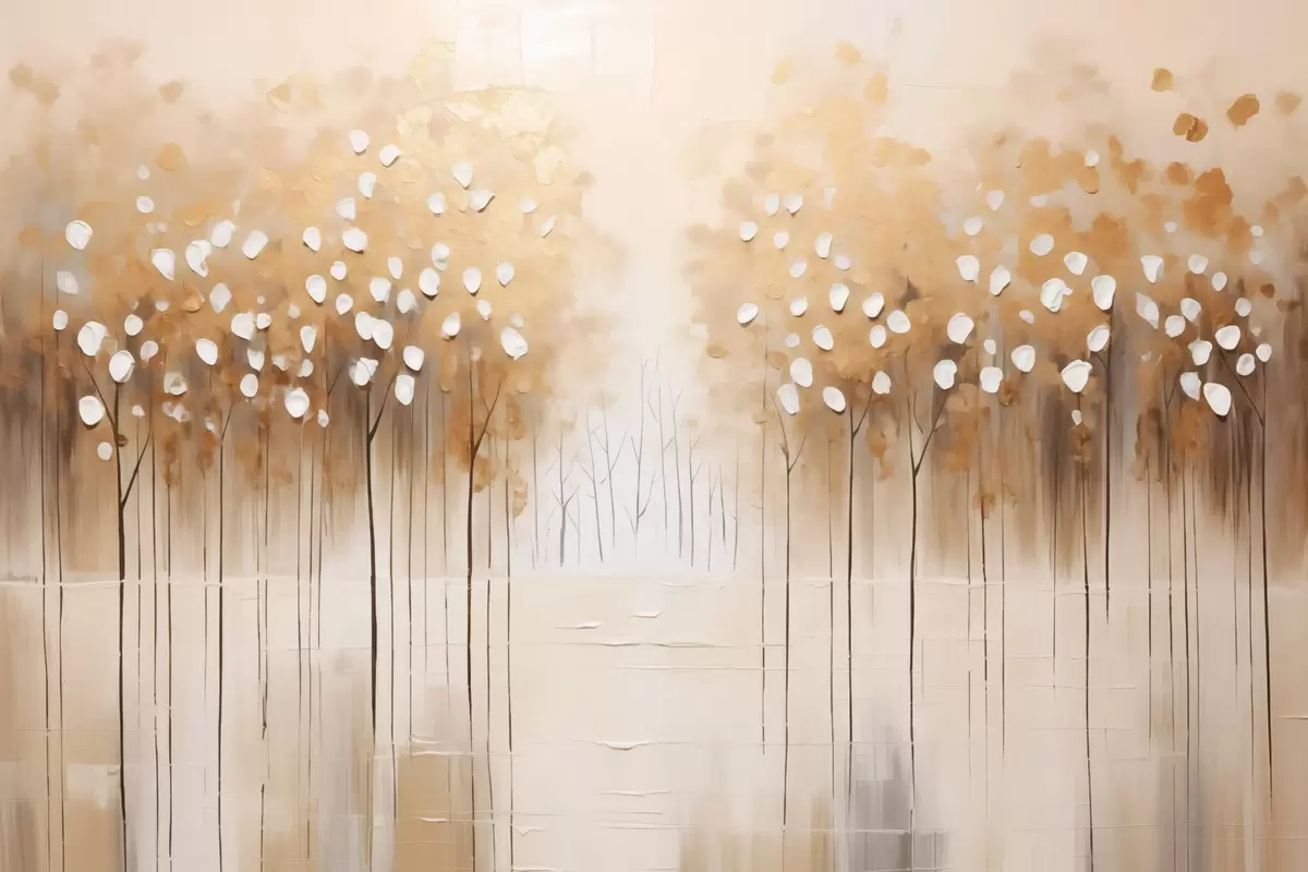 Maalid Õlimaal imitatsioon pruunid puud valge lehed metsas koos jõe keskel, valge taustaga Nr s43172