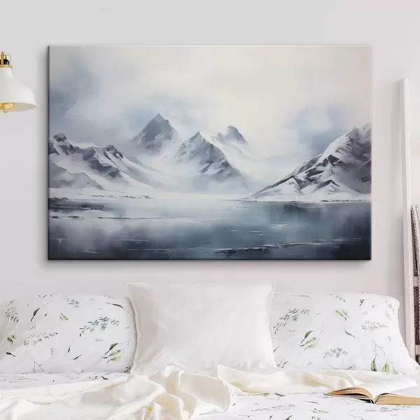 Maalid Lumine mägimaastik koos järvega esiplaanil, tipud on kaetud lumega ja taevas on pilvine Nr s43174