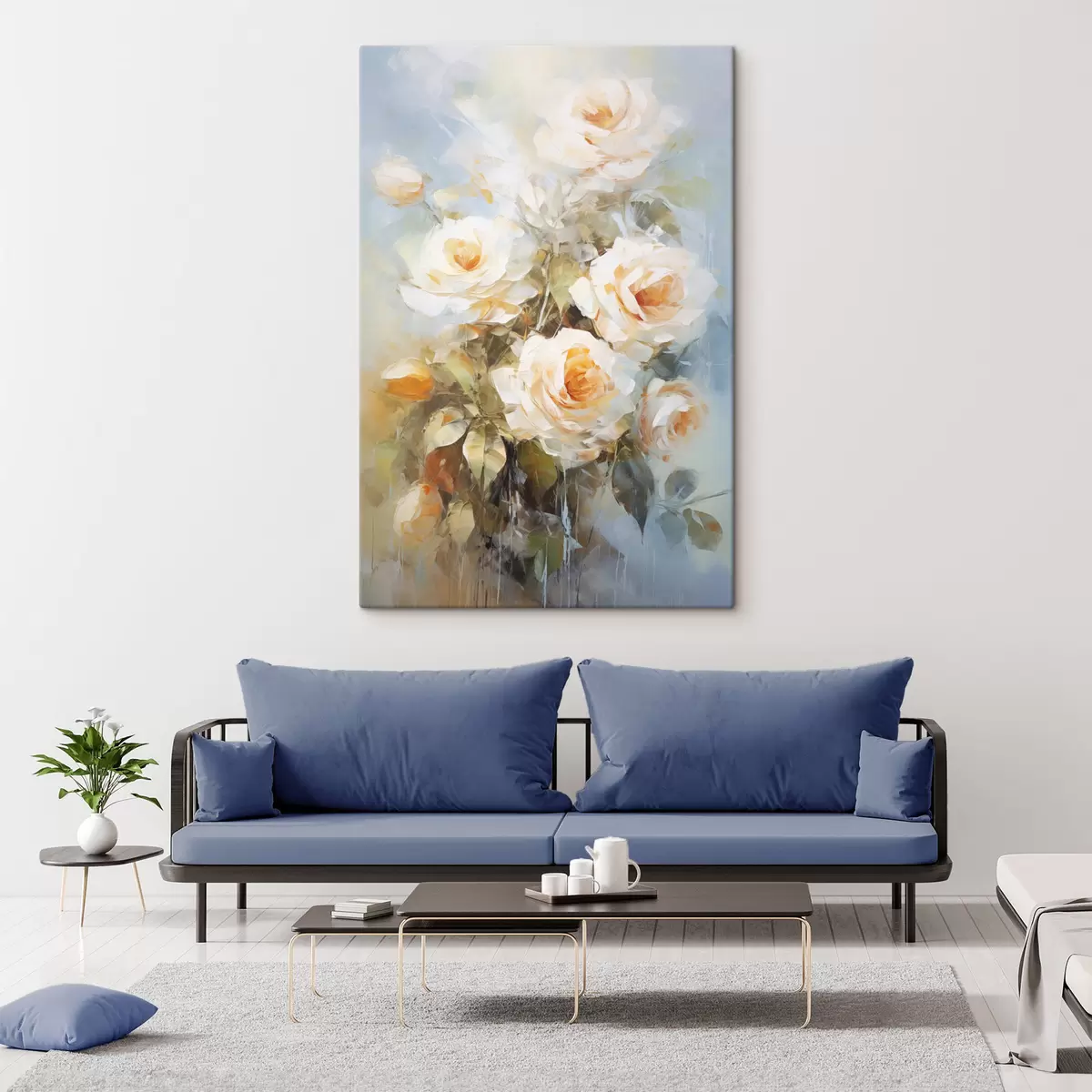 Maalid Valged roosid koos oranžiga, pehmel helesinisel taustal, nähtava pintslitõmbega ja maalikunstniku stiiliga Nr s43175
