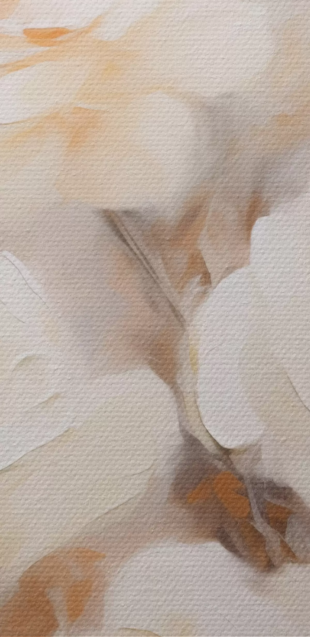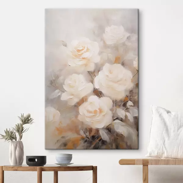Maalid Valged roosid pehmete kroonlehtedega, taustaks vaiksed värvid ja hägused kujundid, mis loovad unenäolise efekti Nr s43177