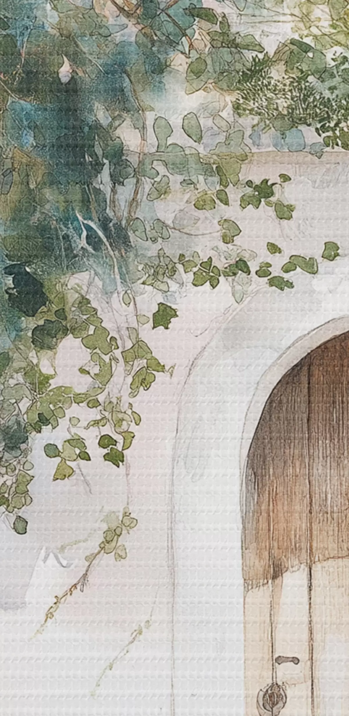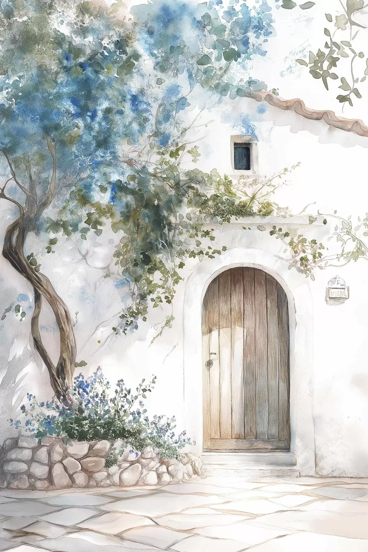 Maalid Kaunis valge maja koos õitsva puuga, Vahemere, akvarellistiilis Nr s43179