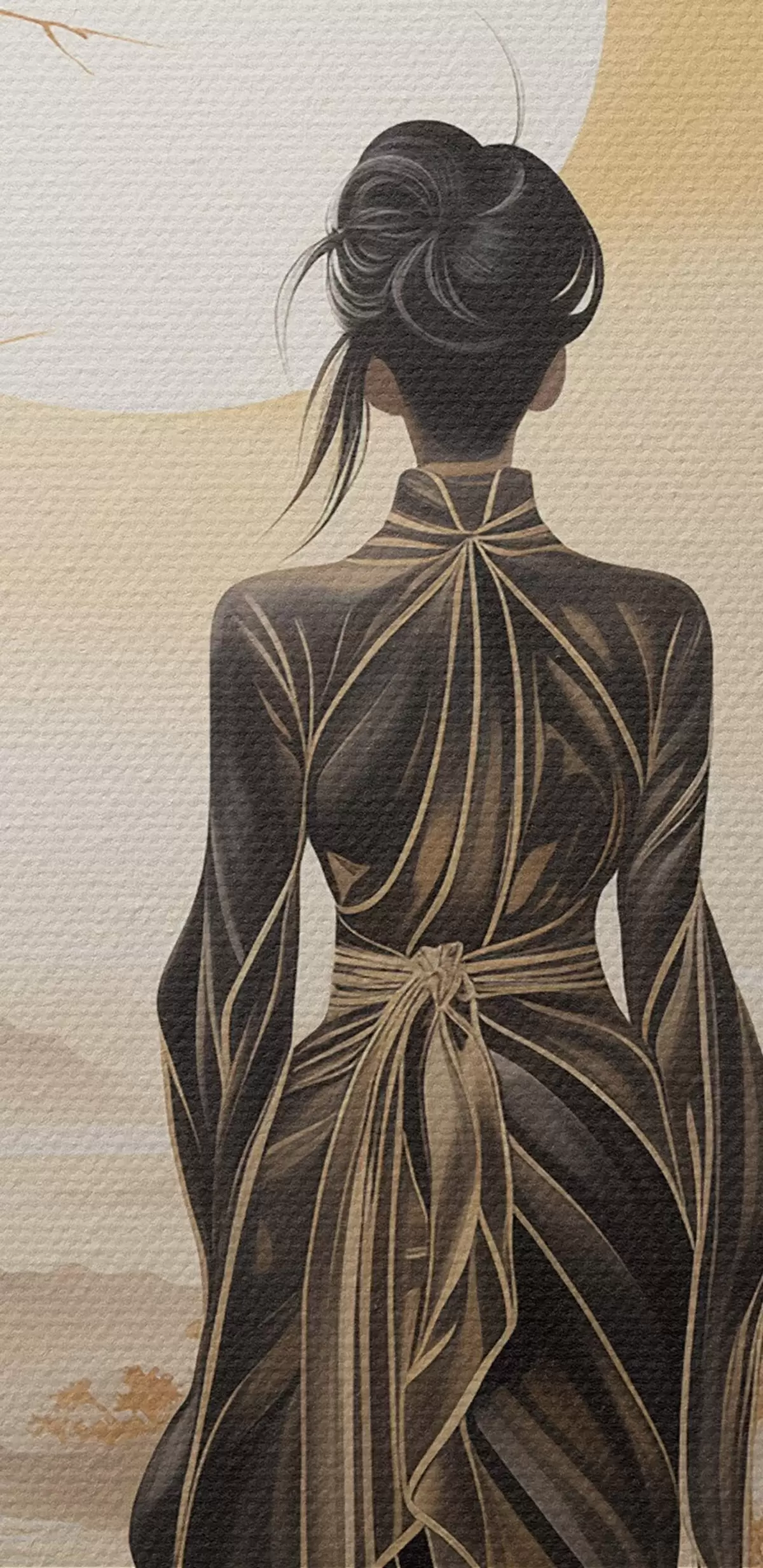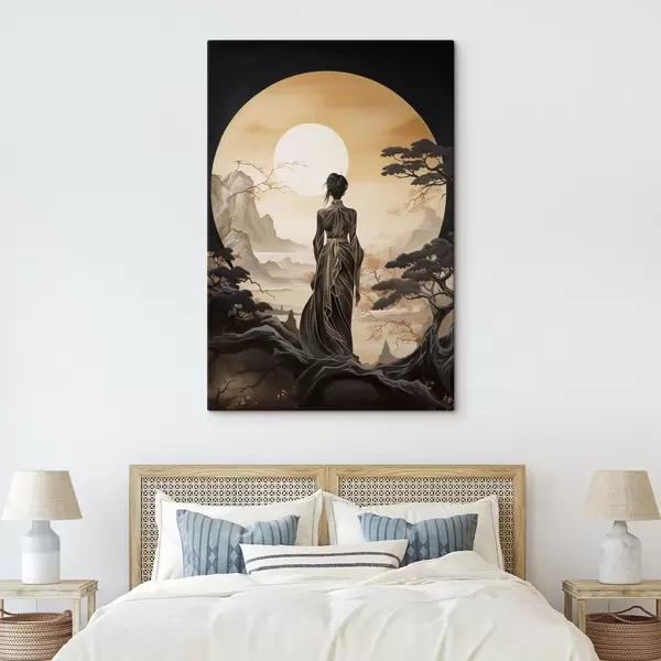 Maalid Inimesed, Jaapan, tüdruk päikeseloojangul sakura ja mägede taustal Nr s43256