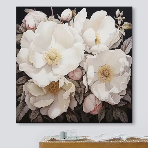 Maalid Valge ploomi lilled tumedal taustal akrüülmaali stiilis Nr s43379