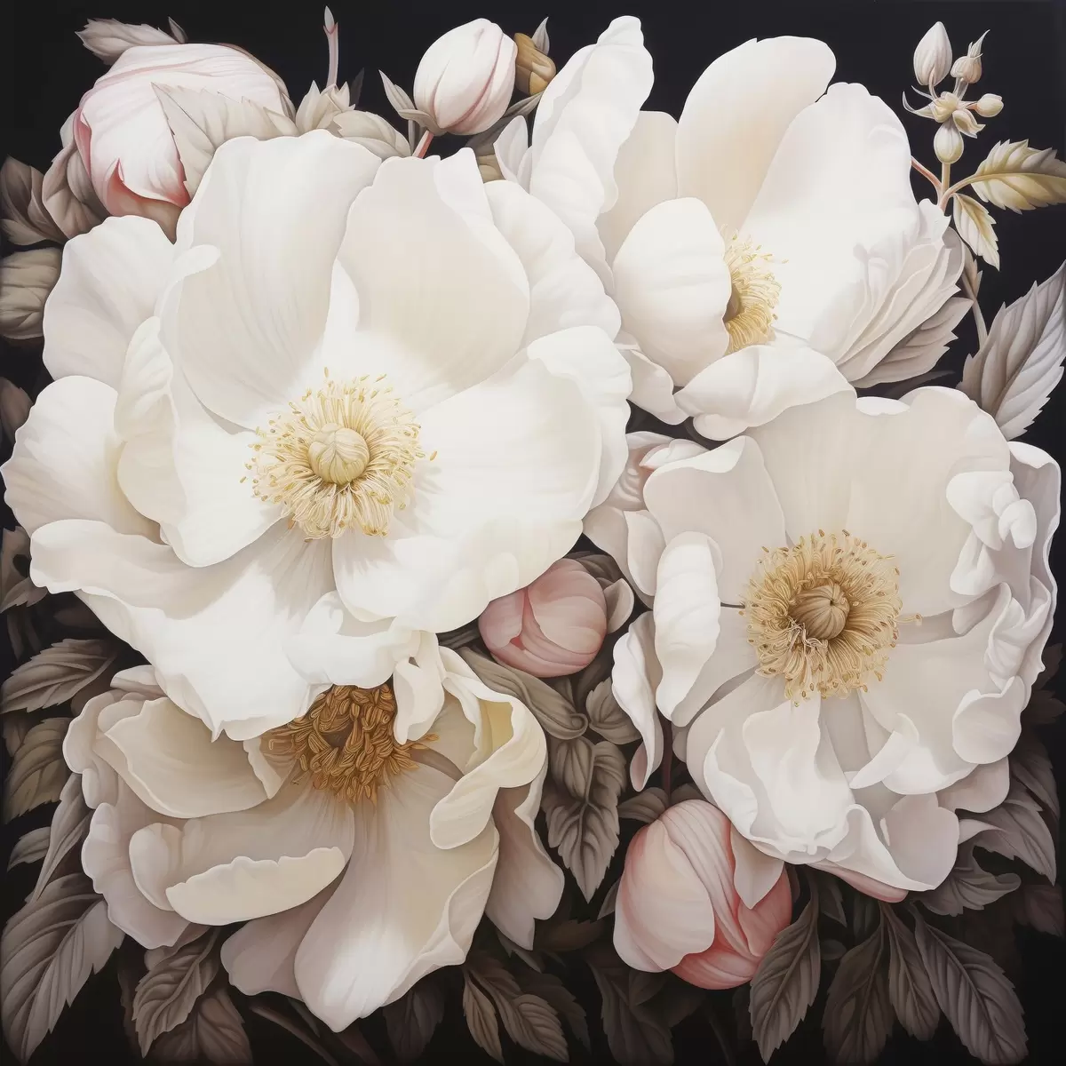 Maalid Valge ploomi lilled tumedal taustal akrüülmaali stiilis Nr s43379