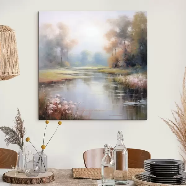 Maalid Metsa loodus koos jõe, lillede ja puudega Nr s43386