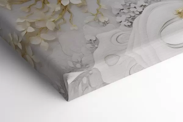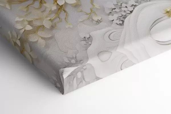 Pilt Dekoratiivne puu valgete lilledega, valge taust, valged kivid, keerulised detailid, loodusest inspireeritud kunst s43388