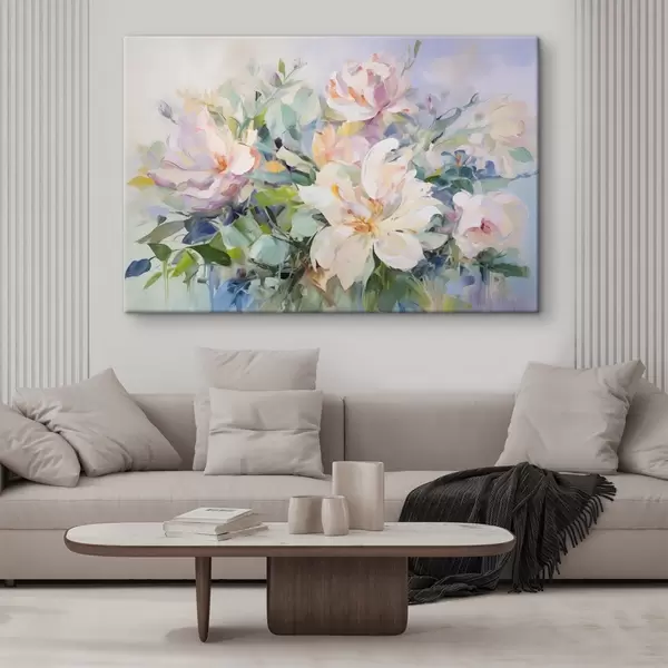 Maalid Lilleseade, millel on pastellvärvilised lilled siniste lehtedega, õlimaali imitatsioon Nr s43390
