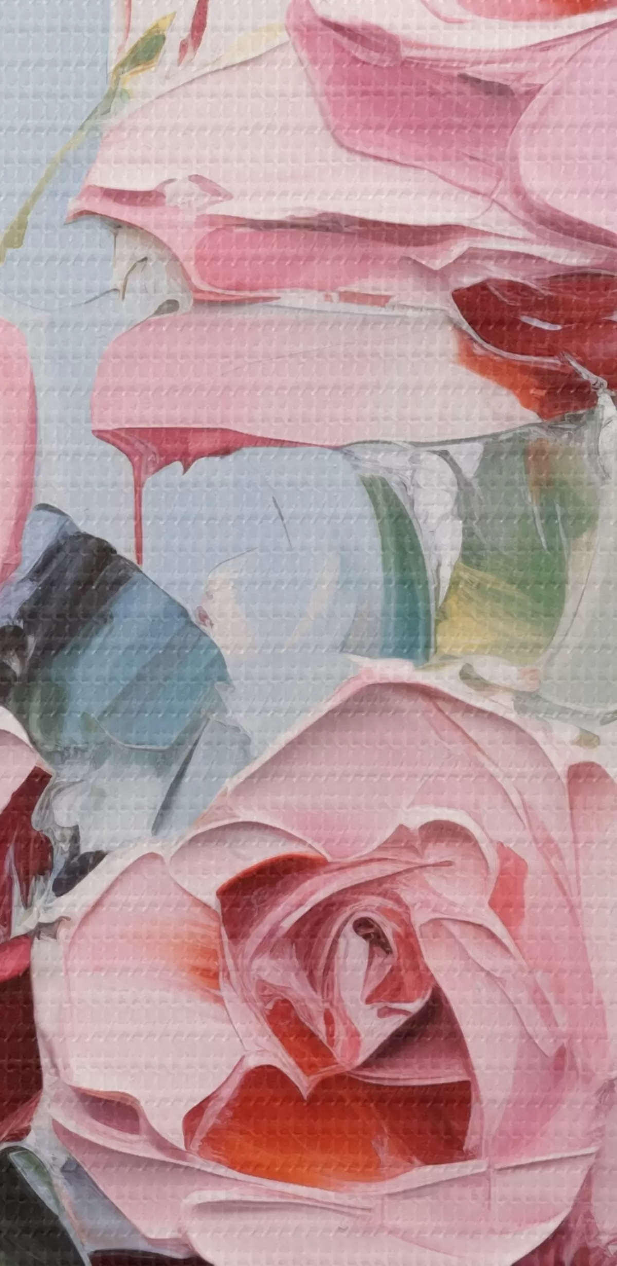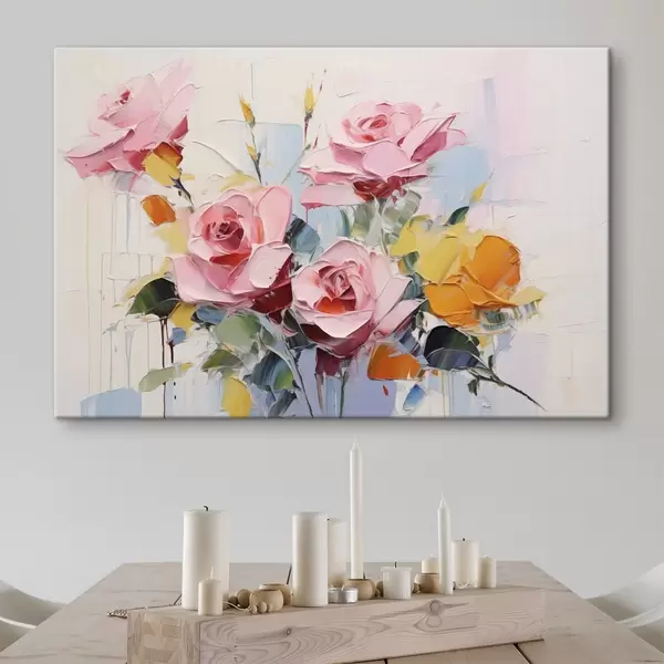 Maalid Moodne abstraktne kunst roosa ja kollane roosade lehtedega, paksud pintslitõmbed, õlimaali imitatsioon, pastellvärvid Nr s43392