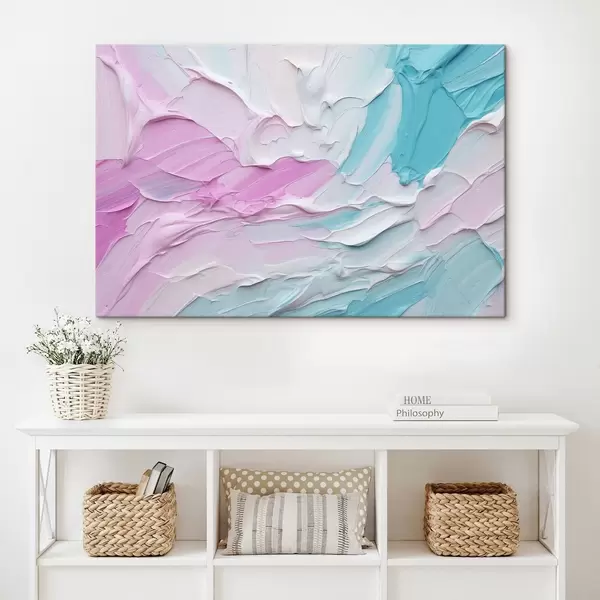Maalid Abstraktne õlimaali imitatsioon paksude roosa, valge ja türkiissinise värviga, mis tekitab tekstuurse efekti Nr s43393